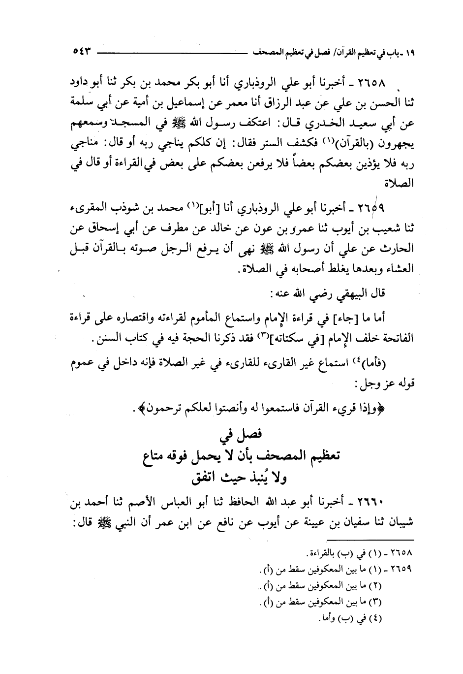 2658 - أخبرنا أبو علي الروذباري أنا أبو بكر محمد بن بكر ثنا أبو داود ثنا الحسن بن علي عن عبد الرزاق أنا معمر عن إسماعيل بن أمية عن أبي سلمة عن أبي سعيد الخدري قال : اعتكف رسول الله في المسجد و سمعهم يجهرون بالقرآن فكشف الستر فقال : إن كلكم يناجي ربه أو قال : مناجي ربه فلا يؤذين بعضكم بعضا فلا يرفعن بعضكم على بعض في القراءة أو قال في الصلاة