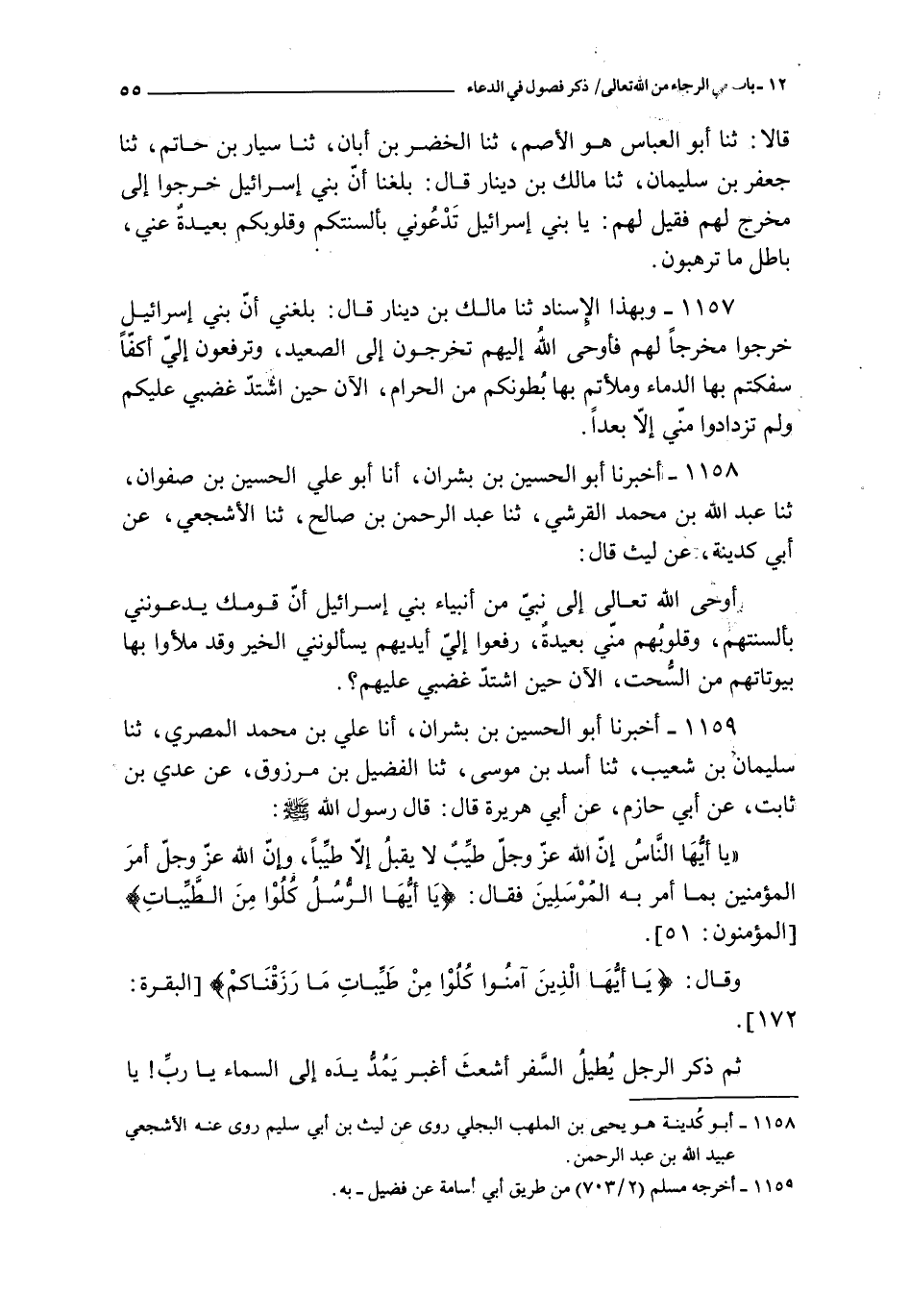 1158 - أخبرنا أبو الحسين بن بشران أنا أبو علي الحسين بن صفوان ثنا عبد الله بن محمد القرشي ثنا عبد الرحمن بن صالح ثنا الأشجعي عن أبي كدينة عن ليث قال : أوحى الله تعالى غلى نبي من أنبياء بني إسرائيل أن قومك يدعونني بألسنتهم وقلوبهم مني بعيدة رفعوا إلى أيديهم يسألونني الخير و قد ملأوا بها بيوتاتهم من السحت الآن حين اشتد غضبي عليهم ؟