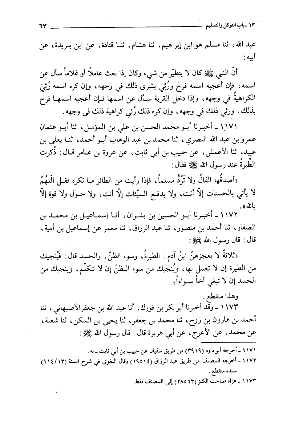 في الإنسان ثلاثة : الطيرة و الظن و الحسد فمخرجه من الطيرة أن لا يرجع و مخرجه من الظن ألا يحقق و مخرجه من الحسد أن لا ينبغي