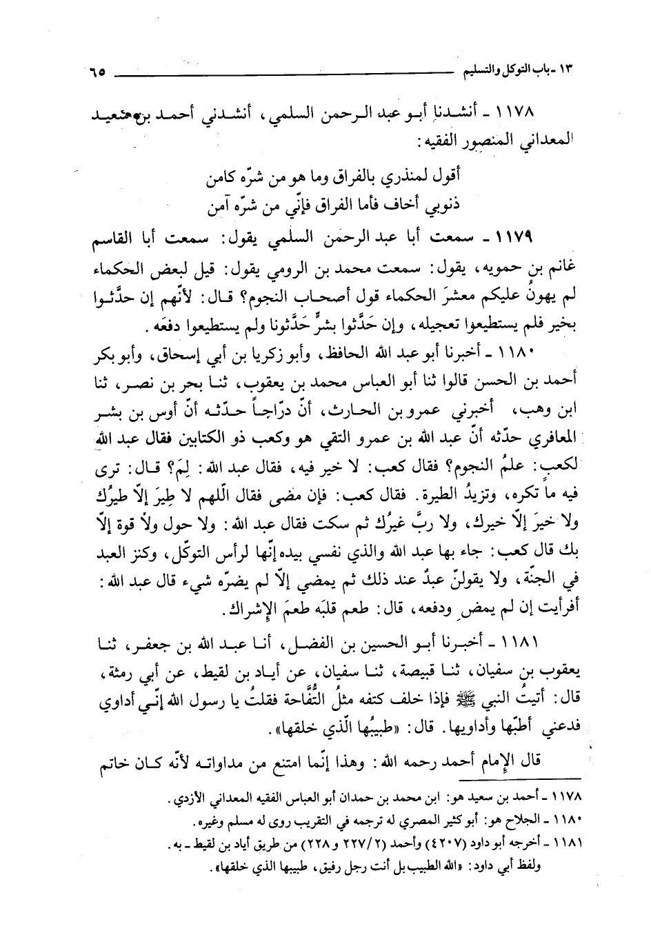 1180 - أخبرنا أبو عبد الله الحافظ و أبو زكريا بن أبي إسحاق و أبو بكر أحمد بن الحسن قالوا ثنا أبو العباس محمد بن يعقوب ثنا بحر بن نصر ثنا ابن وهب أخبرني عمرو بن الحارث أن دراجا حدثه أن أوس بن بشر المعافري حدثه أن : ـ عبد الله بن عمرو التقي هو و كعب ذو الكتابين فقال عبد الله لكعب : علم النجوم ؟ فقال كعب : لا خير فيه فقال عبد الله : لم ؟ قال : ترى فيه ما تكره و تزيد الطيرة فقال كعب : فإن مضى فقال اللهم لا طير إلا طيرك و لا خير إلا خيرك و لا رب غيرك ثم سكت فقال عبد الله : و لا حول و لا قوة إلا بك قال كعب : جاء بها عبد الله و الذي نفسي بيده إنها لرأس التوكل و كنز العبد في الجنة و لا يقولن عبد عند ذلك ثم يمضي إلا لم يضره شيء قال عبد الله : أفرأيت إن لم يمض و دفعه قال : طعم الإشراك