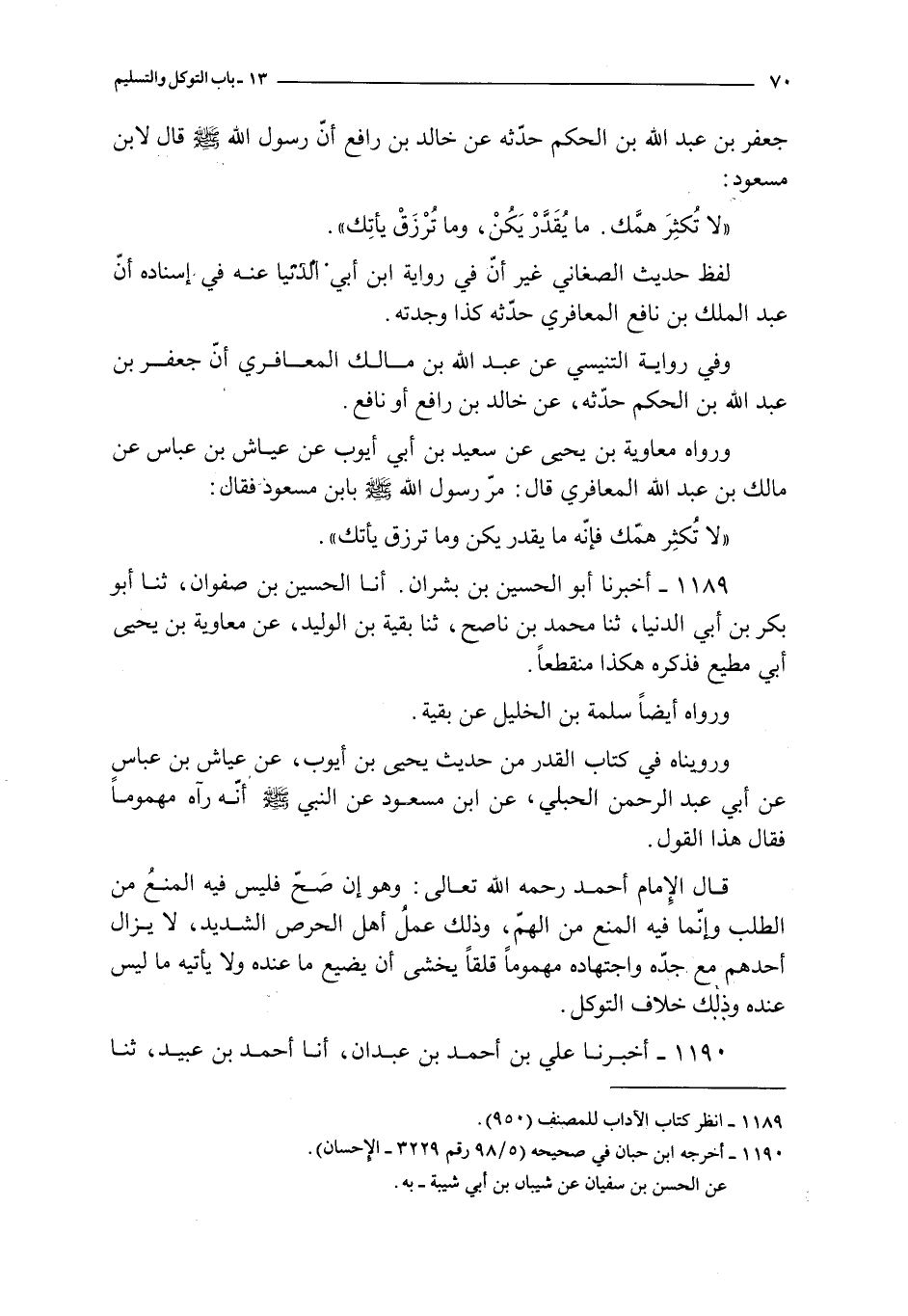 قال الإمام أحمد رحمه الله تعالى : و هو إن صح فليس فيه المنع من الطلب و إنما فيه المنع من الهم و ذلك عمل أهل الحرص الشديد لا يزال أحدهم مع جده و اجتهاده مهموما قلقا يخشى أن يضيع ما عنده و لا يأيته ما ليس عنده و ذلك خلاف التوكل