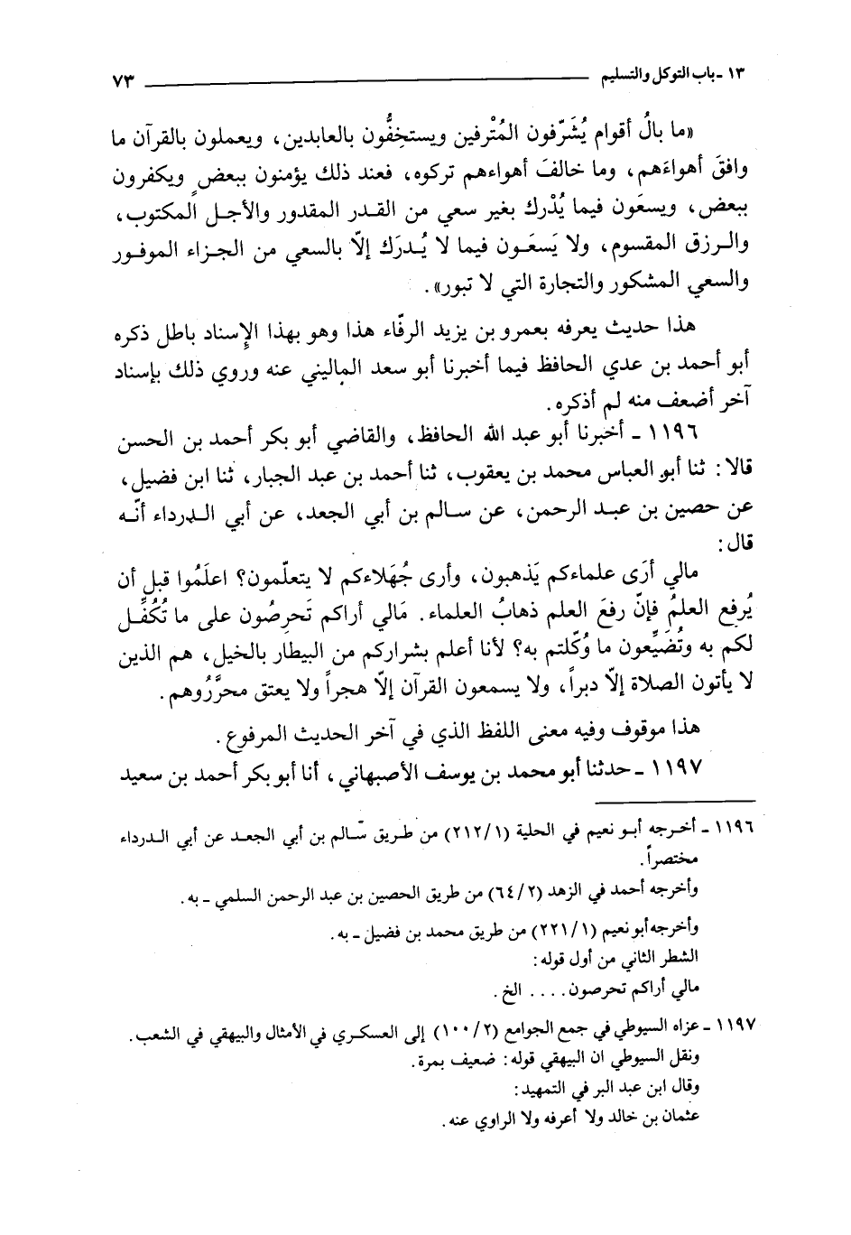 1196 - أخبرنا أبو عبد الله الحافظ و القاضي أبو بكر أحمد بن الحسن قالا : ثنا أبو العباس محمد بن يعقوب ثنا أحمد بن عبد الجبار ثنا ابن فضيل عن حصين بن عبد الرحمن عن سالم بن أبي الجعد عن أبي الدرداء أنه قال : ما لي أرى علماءكم يذهبون و أرى جهلاءكم لا يتعلمون ؟ اعلموا قبل أن يرفع العلم فإن رفع العلم ذهاب العلماء ما لي أراكم تحرصون على ما تكفل لكم به و تضيعون ما وكلتم به ؟ لأنا أعلم بشراركم من البيطار بالخيل هم الذين لا يأتون الصلاة إلا دابرا و لا يسمعون القرآن إلا هجرا و لا يعتق محرروهم