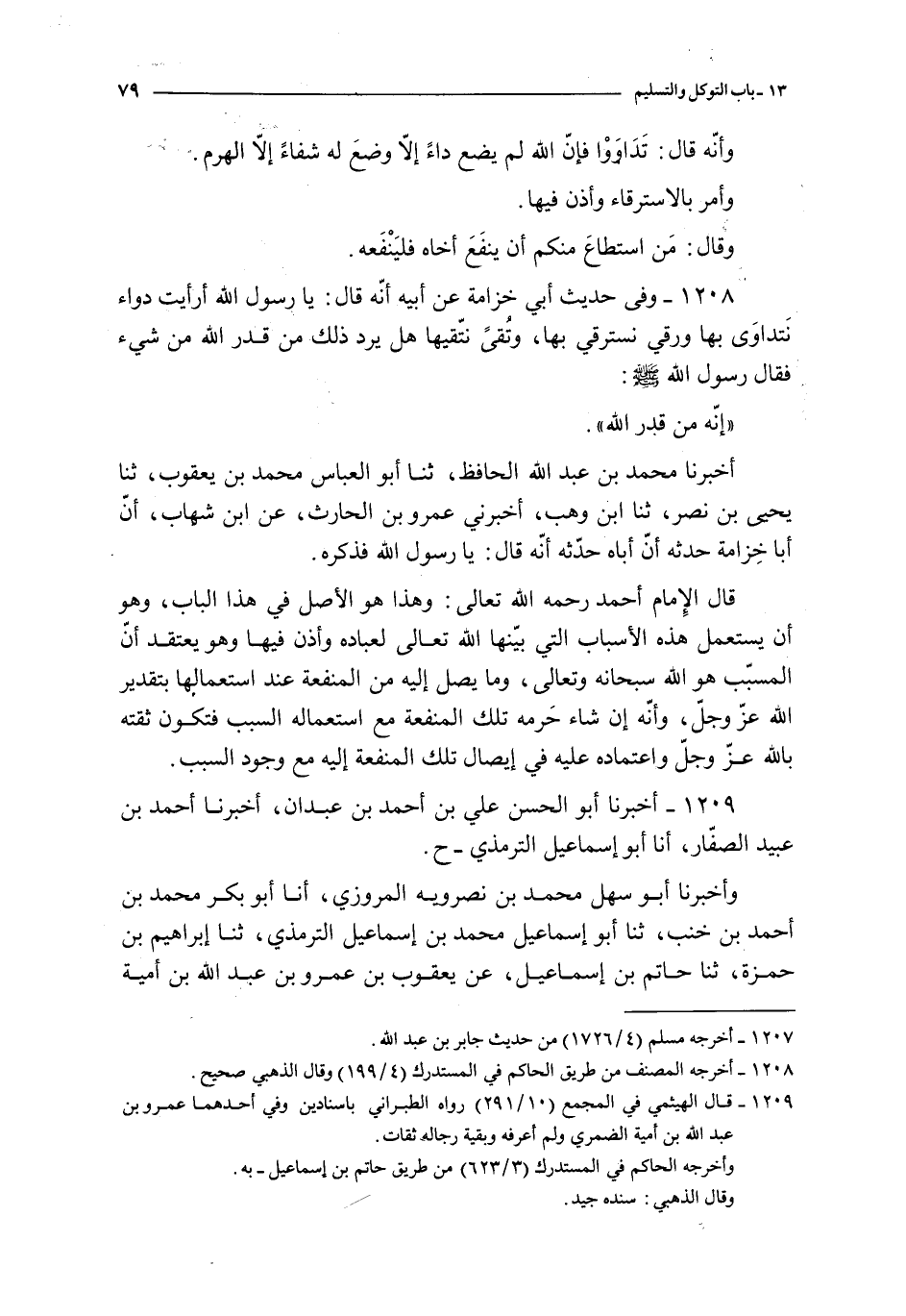 و أخبرنا أبو سهل محمد بن نصرويه المروزي أنا أبو بكر محمد بن أحمد بن خنب ثنا أبو إسماعيل محمد بن إسماعيل الترمذي ثنا إبراهيم بن حمزة ثنا حاتم بن إسماعيل عن يعقوب بن عمرو بن عبد الله بن أمية الضمري عن جعفر بن عمرو قال : قال عمرو بن أمية الضمري : يا رسول الله أرسل راحلتي و أتوكل ؟ قال : بل قيدها و توكل و لفظها سواء