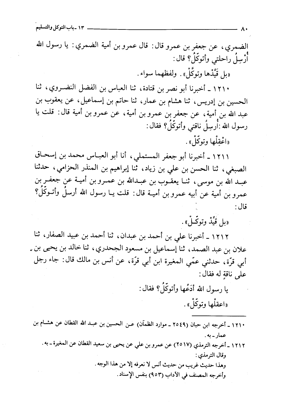 1210 - أخبرنا أبو نصر بن قتادة ثنا العباس بن الفضل النضروي ثنا الحسين بن إدريس ثنا هشام بن عمار ثنا حاتم بن إسماعيل عن يعقوب بن عبد الله بن أمية عن جعفر بن عمرو بن أمية عن جعفر بن عمرو بن أمية عن عمرو بن أمية قال : قلت يا رسول الله : أرسل ناقتي و أتوكل ؟ فقال : اعقلها و توكل