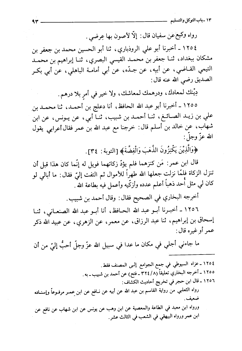 قال ابن عمر : من كنزهما فلم يؤد زكاتهما فويل له إنما كان هذا قبل أن تنزل الزكاة فلما نزلت جعلها الله طهرا للأموال ثم التفت إلي فقال : ما أبالي لو كان لي مثل أحد ذهبا أعلم عدده و أزكيه و أعمل فيه بطاعة الله