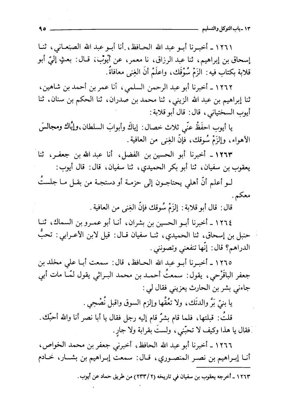 1263 - أخبرنا أبو الحسين بن الفضل أنا عبد الله بن جعفر ثنا يعقوب بن سفيان ثنا أبو بكر الحميدي ثنا سفيان قال : قال أيوب : لو أعلم أن أهلي يحتاجون إلى حزمة أو دستجة من بقل ما جلسا معكم
