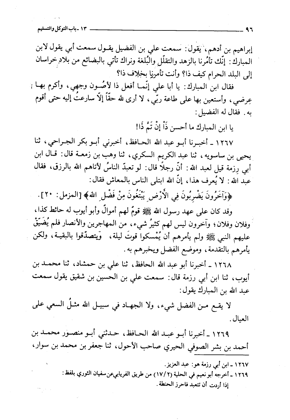 1268 - أخبرنا أبو عبد الله الحافظ ثنا علي بن حمشاد ثنا محمد بن أيوب ثنا ابن أبي رزمة قال : سمعت علي بن الحسين بن شقيق يقول سمعت عبد الله بن المبارك يقول : لا يقع من الفضل شيء و لا الجهاد في سبيل مثل السعي على العيال