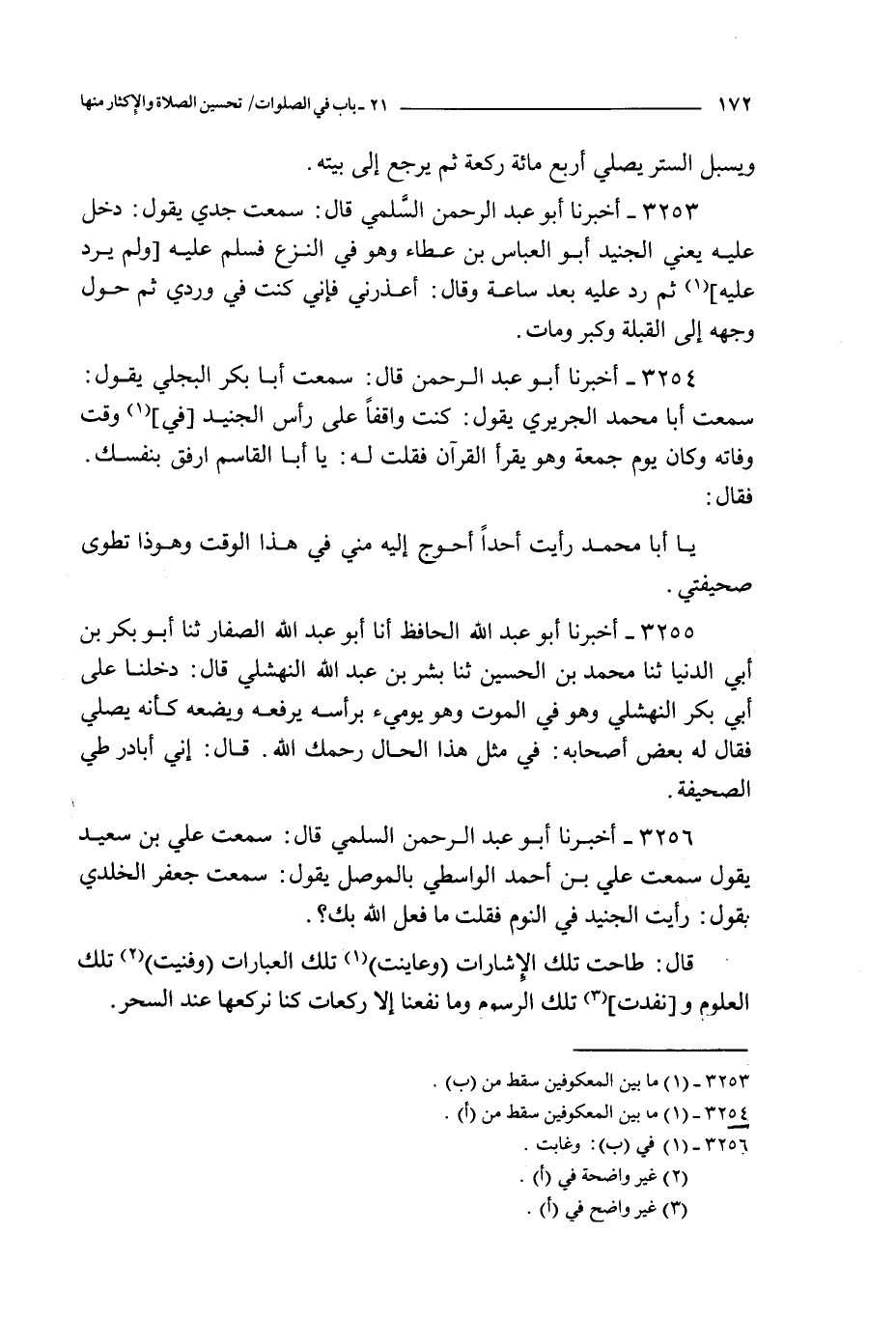 3253 - أخبرنا أبو عبد الرحمن السلمي قال : سمعت جدي يقول : دخل عليه يعني الجنيد أبو العباس بن عطاء و هو ينزع فسلم عليه و لم يرد عليه ثم رد عليه بعد ساعة و قال : أعذرني فإني كنت في وردي ثم حول وجهه إلى القبلة و كبر و مات