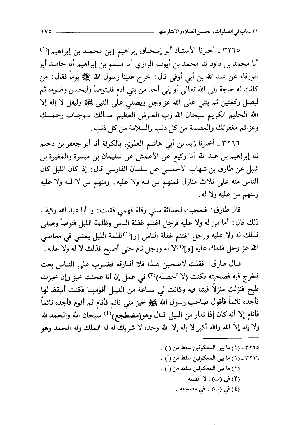 3266 - أخبرنا زيد بن أبي هاشم العلوي بالكوفة أنا أبو جعفر بن دحيم ثنا إبراهيم بن عبد الله أنا وكيع عن الأعمش عن سليمان بن ميسرة و المغيرة بن شبل عن طارق بن شهاب الأحمسي عن سلمان الفارسي قال : إذا كان الليل كان الناس منه على ثلاث منازل فمنهم من له و لا عليه و منهم من لا له و لا عليه و منهم من عليه و لا له