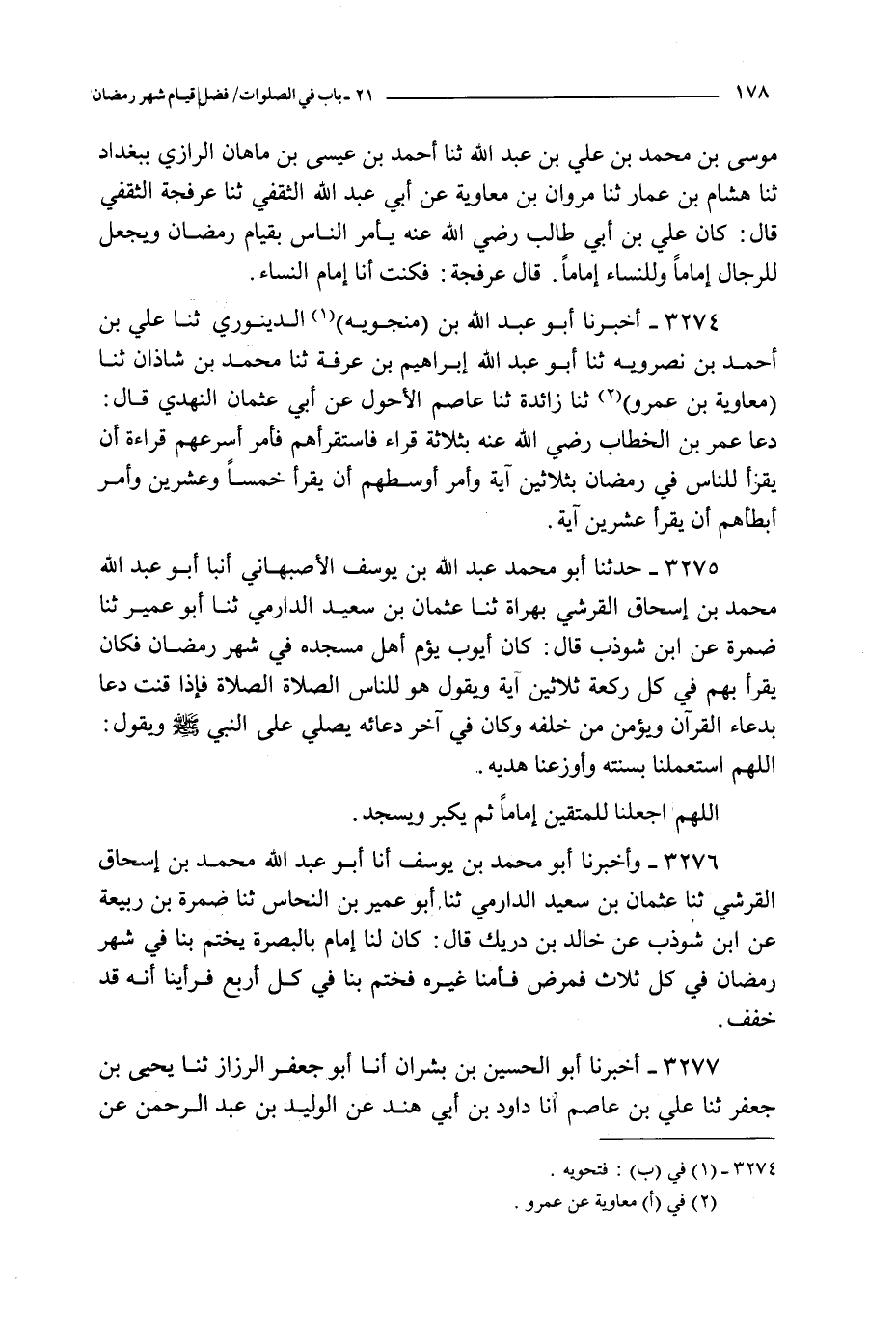 3274 - أخبرنا أبو عبد الله بن منجويه الدينوري ثنا علي بن أحمد بن نصرويه ثنا أبو عبد الله إبراهيم بن عرفة ثنا محمد بن شاذان ثنا معاوية بن عمرو ثنا زائدة ثنا عاصم الأحول عن أبي عثمان النهدي قال : دعا عمر بن الخطاب رضي الله عنه بثلاثة قراء فاستقرأهم فأمر أسرعهم قراءة أن يقرأ للناس في رمضان بثلاثين آية و أمر أوسطهم أن يقرأ خمسا و عشرين و أمر أبطأهم أن يقرأ عشرين آية