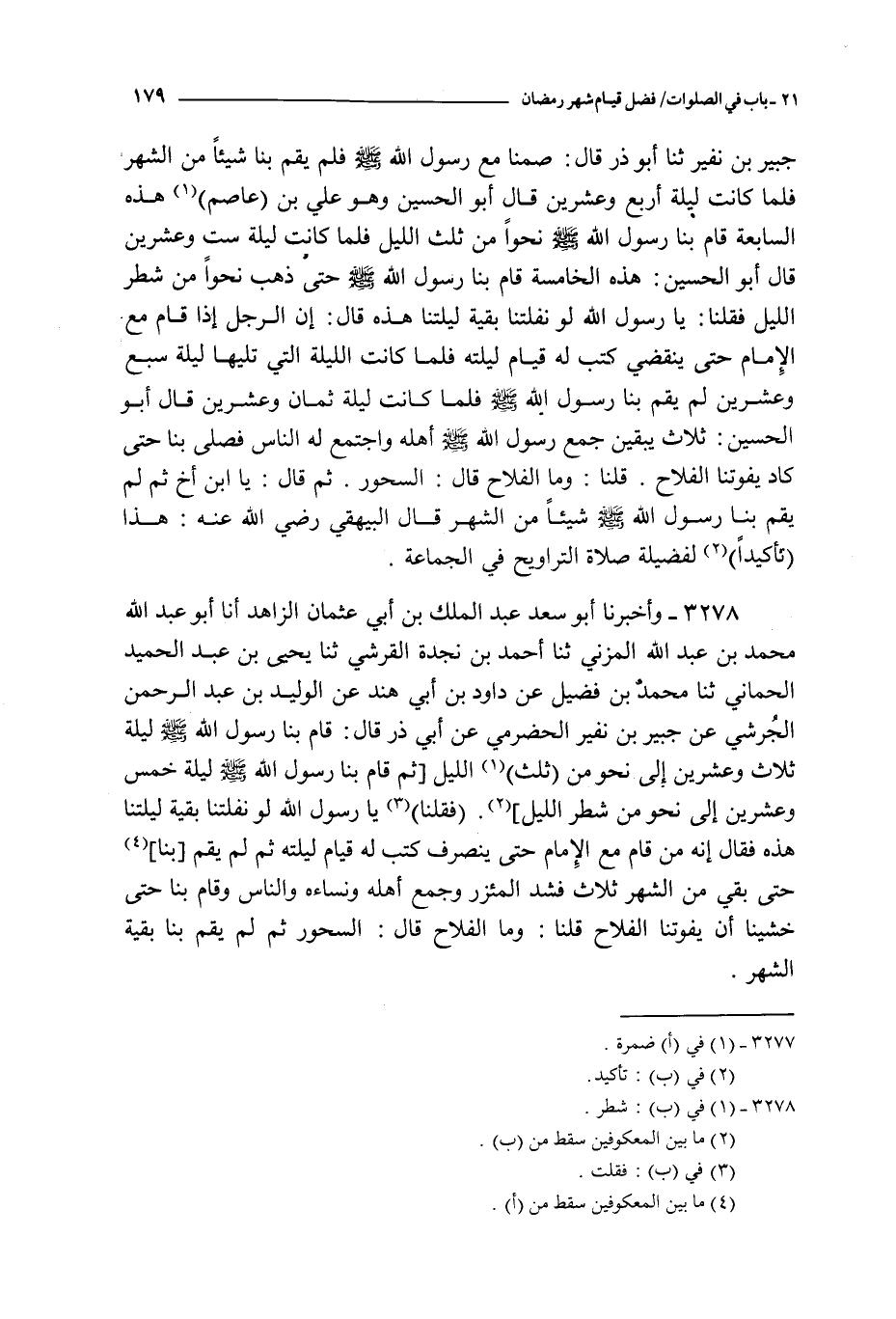 3278 - و أخبرنا أبو سعد عبد الملك بن أبي عثمان الزاهد أنا أبو عبد الله محمد بن عبد الله المزني ثنا أحمد بن نجدة القرشي ثنا يحيى بن عبد الحميد الحماني ثنا محمد بن فضيل عن داود بن أبي هند عن الوليد بن عبد الرحمن الجرشي عن جبير بن نفير الحضرمي عن أبي ذر قال : قام بنا رسول الله صلى الله عليه و سلم ليلة ثلاث و عشرين إلى نحو من ثلث الليل ثم قام بنا رسول الله صلى الله عليه و سلم ليلة خمس و عشرين إلى نحو من شطر الليل فقلنا يا رسول الله لو نفلتنا بقية ليلتنا هذه فقال إنه من قام مع الإمام حتى ينصرف كتب له قيام ليلته ثم لم يقم بنا حتى بقي من الشهر ثلاث فشد المئزر و جمع أهله و نساءه و الناس و قام بنا حتى خشينا أن يفوتنا الفلاح قلنا : و ما الفلاح قال : السحور ثم لم يقم بنا بقية الشهر