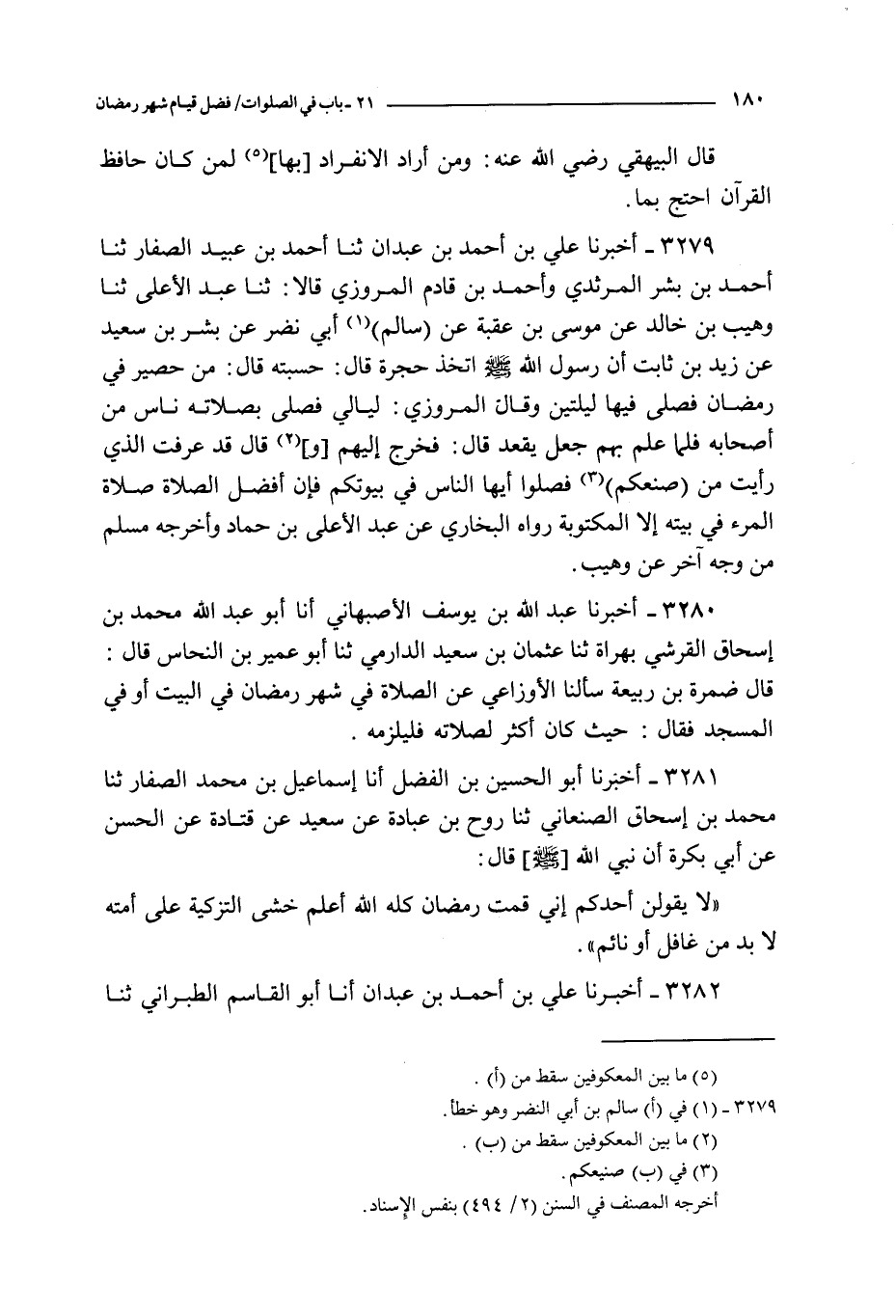 3279 - أخبرنا علي بن أحمد بن عبدان ثنا أحمد بن عبيد الصفار ثنا أحمد بن بشر المرثدي و أحمد بن قادم المروزي قالا : ثنا عبد الأعلى ثنا وهيب بن خالد عن موسى بن عقبة عن سالم أبي نضر عن بشر بن سعيد عن زيد بن ثابت : أن رسول الله صلى الله عليه و سلم اتخذ حجرة قال : حسبته قال : من حصير في رمضان فصلى فيها ليلتين و قال المروزي : ليالي فصلى بصلاته ناس من أصحابه فلما علم بهم جعل يقعد قال : فخرج إليهم و قال قد عرفت الذي رأيت من صنعكم فصلوا أيها الناس في بيوتكم فغن أفضل الصلاة صلاة المرء في بيته إلا المكتوبة رواه البخاري عن عبد الأعلى بن حماد و أخرجه مسلم من وجه آخر عن وهيب