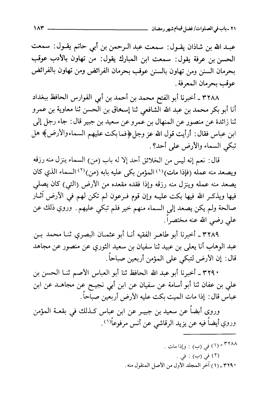 3288 - أخبرنا أبو الفتح محمد بن أحمد بن أبي الفوارس الحافظ ببغداد أنا أبو بكر محمد بن عبد الله الشافعي ثنا إسحاق بن الحسن ثنا معاوية بن عمرو ثنا زائدة عن منصور عن المنهال بن عمرو عن سعيد بن جبير قال : جاء رجل إلى ابن عباس فقال : أرأيت قول الله عز و جل { فما بكت عليهم السماء و الأرض } هل تبكي السماء و الأرض على أحد ؟