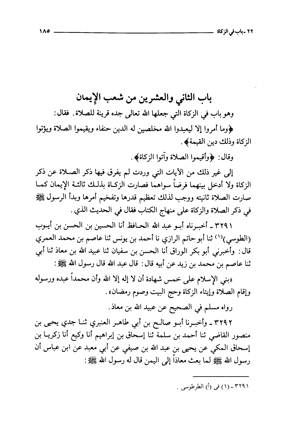 باب الثاني و العشرين من شعب الإيمان ـ و هو باب في الزكاة التي جعلها الله تعالى جده قرينة للصلاة فقال { و ما أمروا إلا ليعبدوا الله مخلصين له الدين حنفاء و يقيموا الصلاة و يؤتوا الزكاة و ذلك دين القيمة } ـ و قال : { و أقيموا الصلاة و آتوا الزكاة } إلى غير ذلك من الآيات التي وردت لم يفرق فيها ذكر الصلاة عن ذكر الزكاة و لا أدخل بينهما فرضا سواهما فصارت الزكاة بذلك ثالثة الإيمان كما صارت الصلاة ثانيته و وجب لذلك تعظيم قدرها و تفخيم أمرها و بدأ الرسول صلى الله عليه و سلم في ذكر الصلاة و الزكاة على منهاج الكتاب فقال في الحديث الذي
