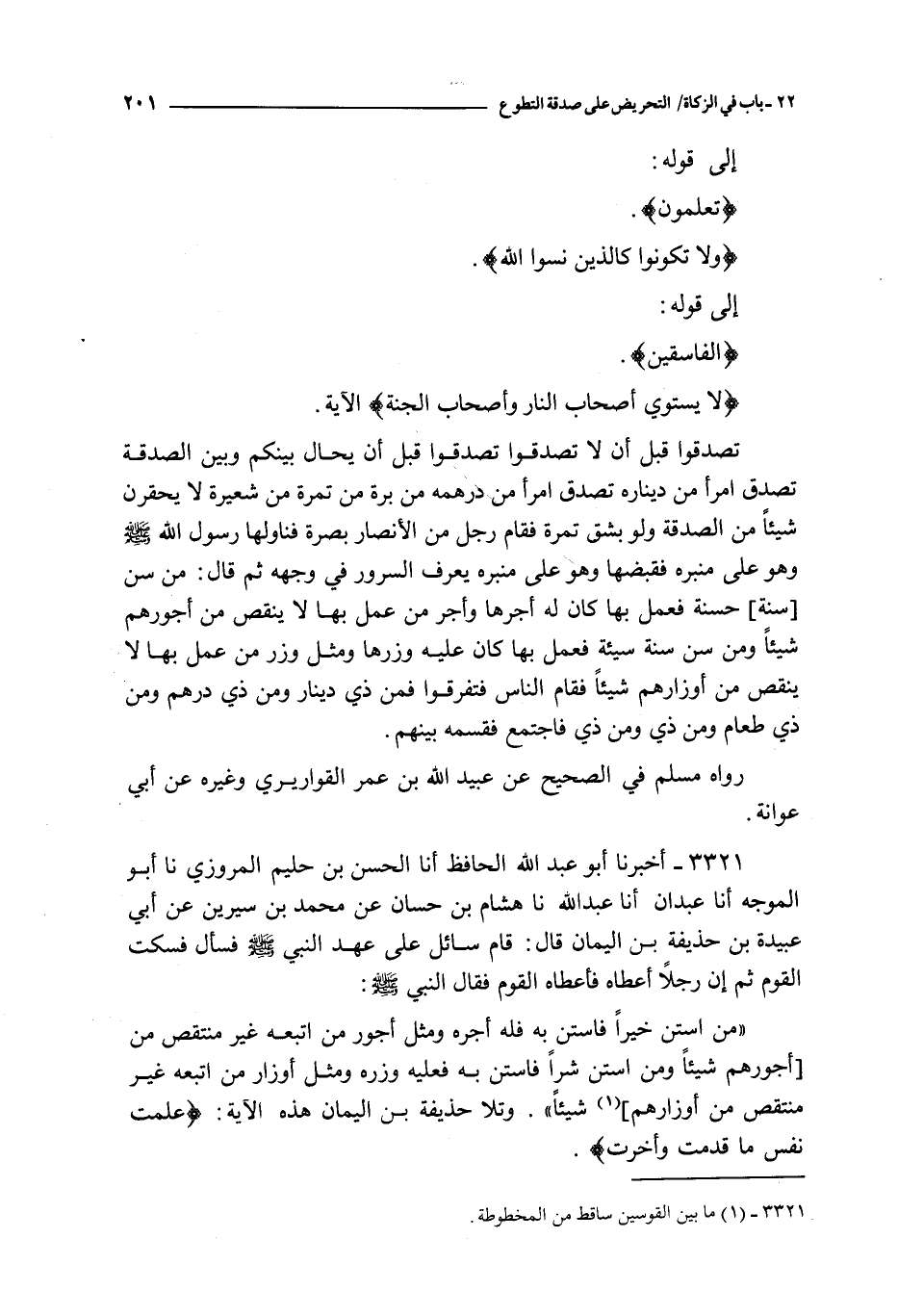 من استن خيرا فاستن به فله أجره و مثل أجور من اتبعه غير منتقص من أجورهم شيئا و من استن شرا فاستن به فعليه وزره و مثل أوزار من اتبعه غير منتقص من أوزارهم شيئا و تلا حذيفة بن اليمان هذه الآية : { علمت نفس ما قدمت و أخرت }