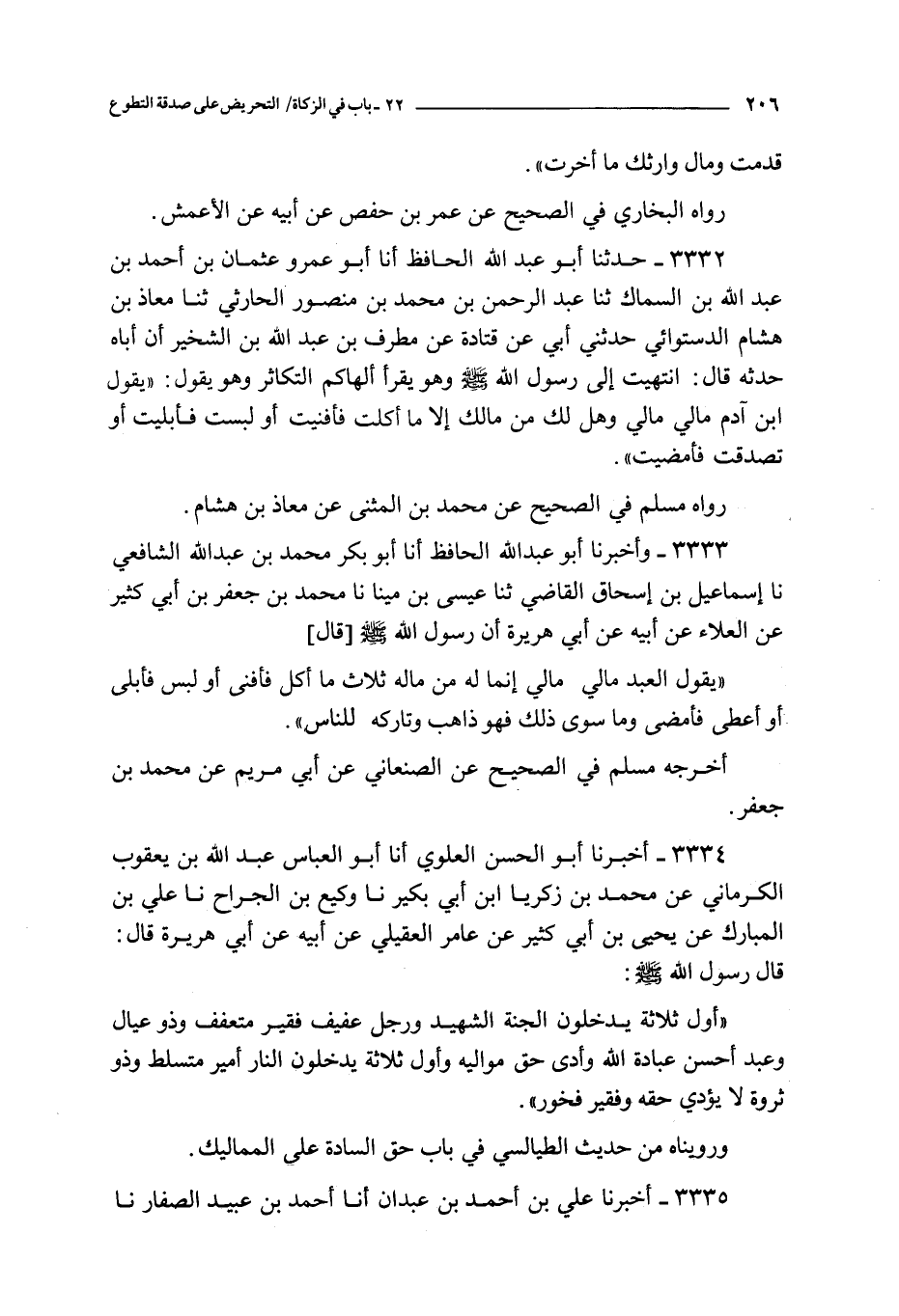 3332 - حدثنا أبو عبد الله الحافظ أنا أبو عمرو عثمان بن أحمد بن عبد الله بن السماك ثنا عبد الرحمن بن محمد بن منصور الحارثي ثنا معاذ بن هشام الدستوائي حدثني أبي عن قتادة عن مطرف بن عبد الله بن الشخير أن أباه حدثه قال : انتهيت إلى رسول الله صلى الله عليه و سلم و هو يقرأ ألهاكم التكاثر و هو يقول : يقول ابن آدم مالي مالي و هل لك من مالك إلا ما أكلت فأفنيت أو لبست فأبليت أو تصدقت فأمضيت