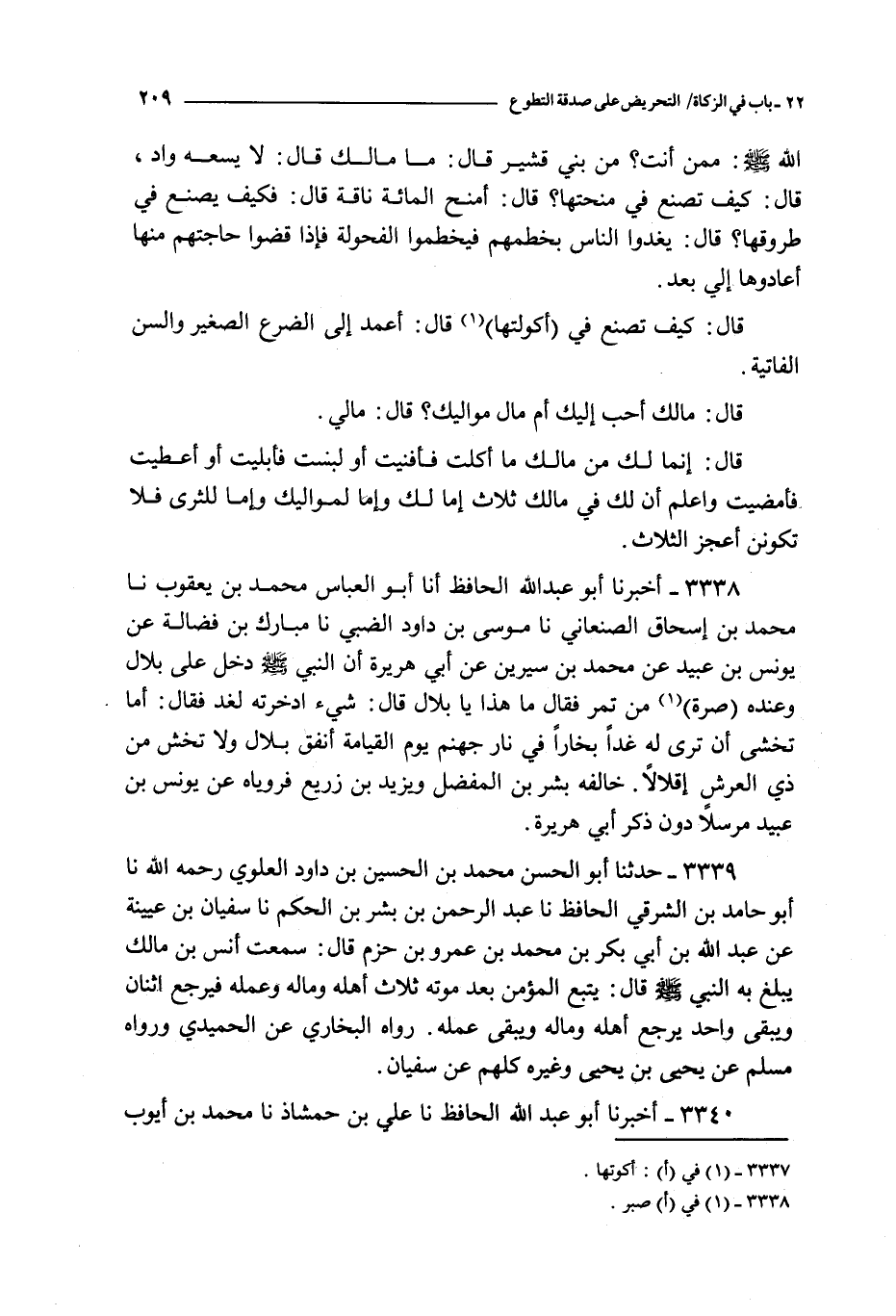 3338 - أخبرنا أبو عبد الله الحافظ أنا أبو العباس محمد بن يعقوب نا محمد بن إسحاق الصنعاني نا موسى بن داود الضبي نا مبارك بن فضالة عن يونس بن عبيد عن محمد بن سيرين عن أبي هريرة : أن النبي صلى الله عليه و سلم دخل على بلال و عنده صرة من تمر فقال ما هذا يا بلال قال : شيء ادخرته لغد فقال : أما تخشى أن ترى له غدا بخارا في نار جهنم يوم القيامة أنفق بلال و لا تخش من ذي العرش إقلالا خالفه بشر بن المفضل و يزيد بن زريع فروياه عن يونس بن عبيد مرسلا دون ذكر أبي هريرة