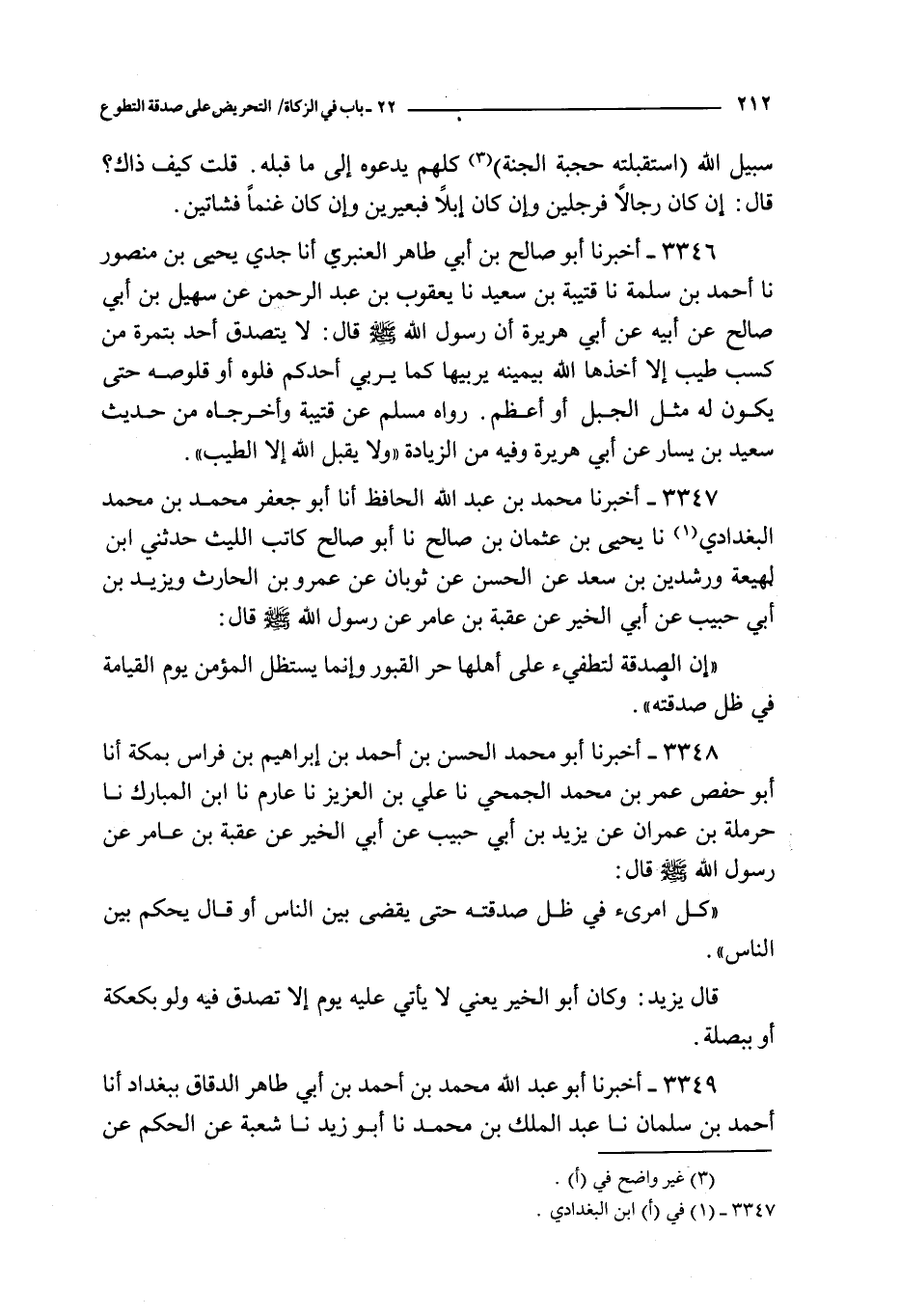 3346 - أخبرنا أبو صالح بن أبي طاهر العنبري أنا جدي يحيى بن منصور نا أحمد بن سلمة نا قتيبة بن سعيد نا يعقوب بن عبد الرحمن عن سهيل بن أبي صالح عن أبيه عن أبي هريرة : أن رسول الله صلى الله عليه و سلم قال : لا يتصدق أحد بتمرة من كسب طيب إلا أخذها الله بيمينه يربيها كما يربي أحدكم فلوه أو قلوصه حتى يكون له مثل الجبل أو أعظم رواه مسلم عن قتيبة و أخرجاه من حديث سعيد بن يسار عن أبي هريرة و فيه من الزيادة و لا يقبل الله إلا الطيب