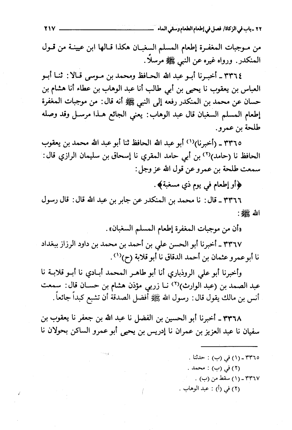 3364 - أخبرنا أبو عبد الله الحافظ و محمد بن موسى قالا : ثنا أبو العباس محمد بن يعقوب نا يحيى بن أبي طالب أنا عبد الوهاب بن عطاء أنا هشام بن حسان عن محمد بن المنكدر رفعه إلى النبي صلى الله عليه و سلم أنه قال : من موجبات المغفرة إطعام المسلم السغبان قال عبد الوهاب : يعني الجائع هذا مرسل و قد وصله طلحة بن عمرو