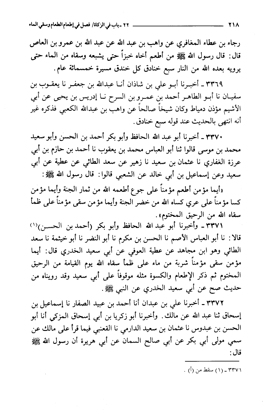 3370 - أخبرنا أبو عبد الله الحافظ و أبو بكر أحمد بن الحسن و أبو سعيد محمد بن موسى قالوا ثنا أبو العباس محمد بن يعقوب نا أحمد بن حازم بن أبي عرزة الغفاري نا عثمان بن سعيد نا زهير عن سعد الطائي عن عطية عن أبي سعيد و عن إسماعيل بن أبي خالد عن الشعبي قالوا : قال رسول الله صلى الله عليه و سلم :