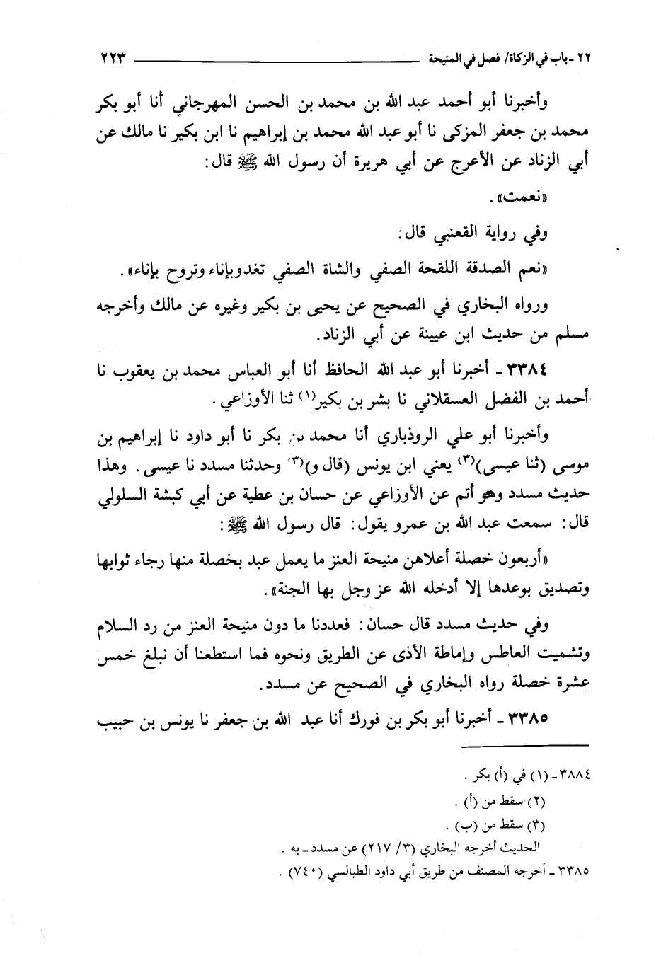 و في حديث مسدد قال حسان : فعددنا ما دون منيحة العنز من رد السلام و تشميت العاطس و إماطة الأذى عن طريق و نحوه فما استطعنا أن نبلغ خمس عشرة خصلة رواه البخاري في الصحيح عن مسدد