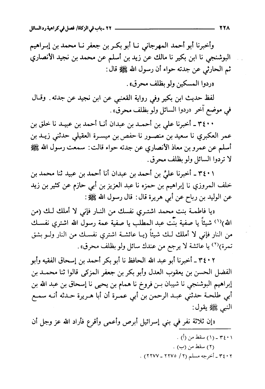 3400 - أخبرنا علي بن أحمد بن عبدان أنا أحمد بن عبيد نا خلق بن عمر العكبري نا سعيد بن منصور نا حفص بن ميسرة العقيلي حدثتي زيد بن أسلم عن عمرو بن معاذ الأنصاري عن جدته حواء قالت : سمعت رسول الله صلى الله عليه و سلم لا تردوا السائل و لو بظلف محرق
