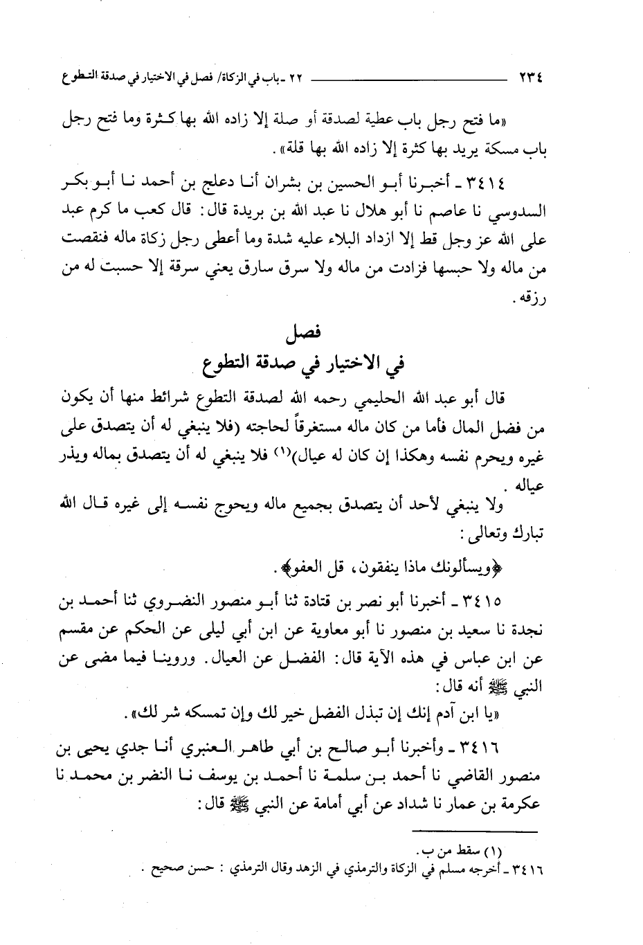 فصل في الاختيار في صدقة التطوع ـ قال أبو عبد الله الحليمي رحمه الله لصدقة التطوع شرائط منها أن يكون من فضل المال فأما من كان ماله مستغرقا لحاجته فلا ينبغي له أن يتصدق على غيره و يحرم نفسه و هكذا إن كان له عيال فلا ينبغي له أن يتصدق بماله و يذر عياله و لا ينبغي لأحد أن يتصدق بجميع ماله و يحوج نفسه إلى غيره قال الله تبارك و تعالى : { ويسألونك ماذا ينفقون قل العفو }