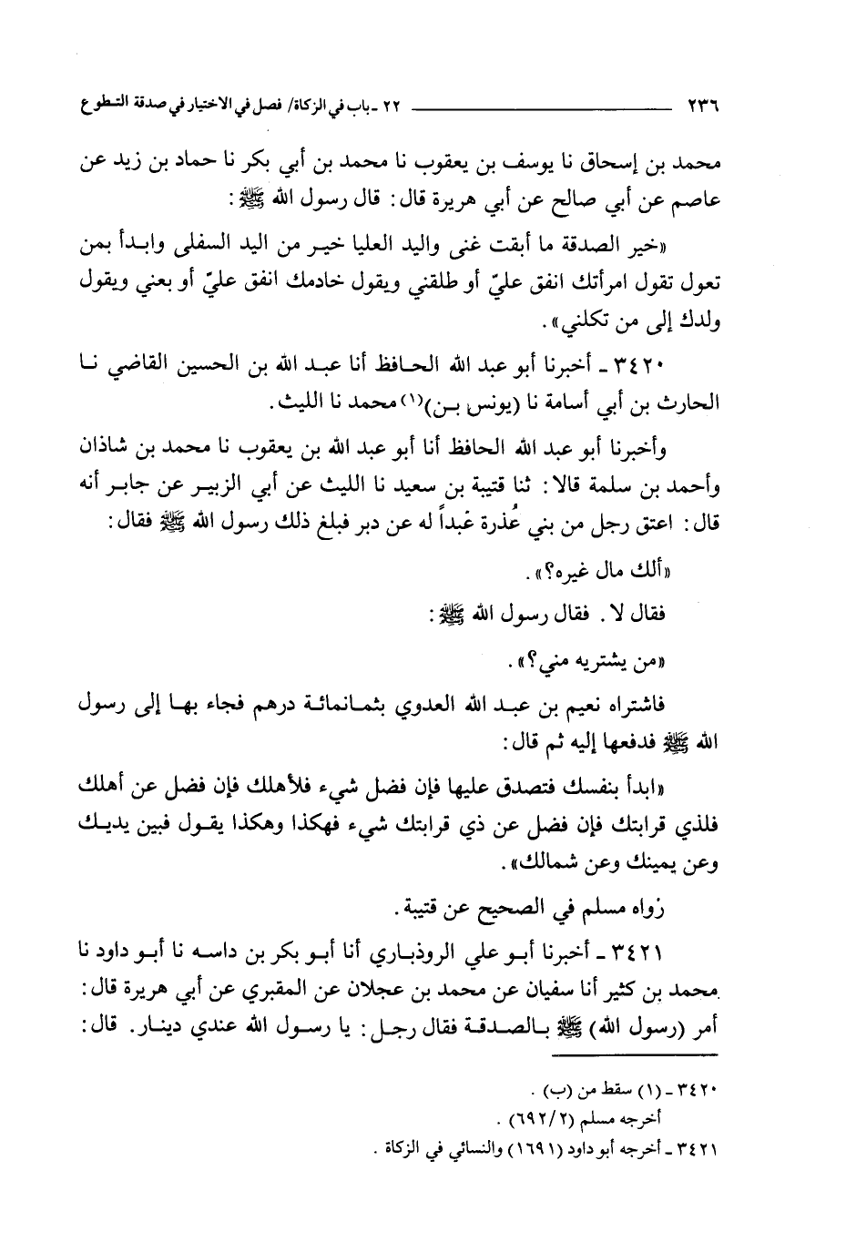 3421 - أخبرنا أبو علي الروذباري أنا أبو بكر بن داسه نا أبو داود نا محمد بن كثير أنا سفيان عن محمد بن عجلان عن المقبري عن أبي هريرة قال : أمر رسول الله صلى الله عليه و سلم بالصدقة فقال رجل : يا رسول الله عندي دينار قال : تصدق به على نفسك قال : عندي آخر قال : تصدق به على ولدك قال : عندي آخر قال : تصدق به على زوجتك أو قال : زوجك قال : عندي آخر قال : تصدق به على خادمك قال : عندي آخر قال أنت أبصر