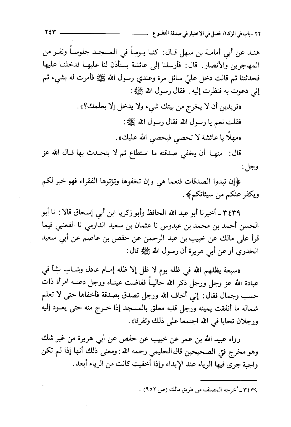 سبعة يظلهم الله في ظله يوم لا ظل إلا ظله إمام عادل و شاب نشأ في عبادة الله عز و جل و رجل ذكر الله خاليا ففاضت عيناه و رجل دعته امرأة ذات حسب و جمال فقال : إني أخاف الله و رجل تصدق بصدقة فأخفاها حتى لا تعلم شماله ما أنفقت يمينه و رجل قلبه معلق بالمسجد إذا خرج منه حتى يعود إليه و رجلان تحابا في الله اجتمعا على ذلك و تفرقا
