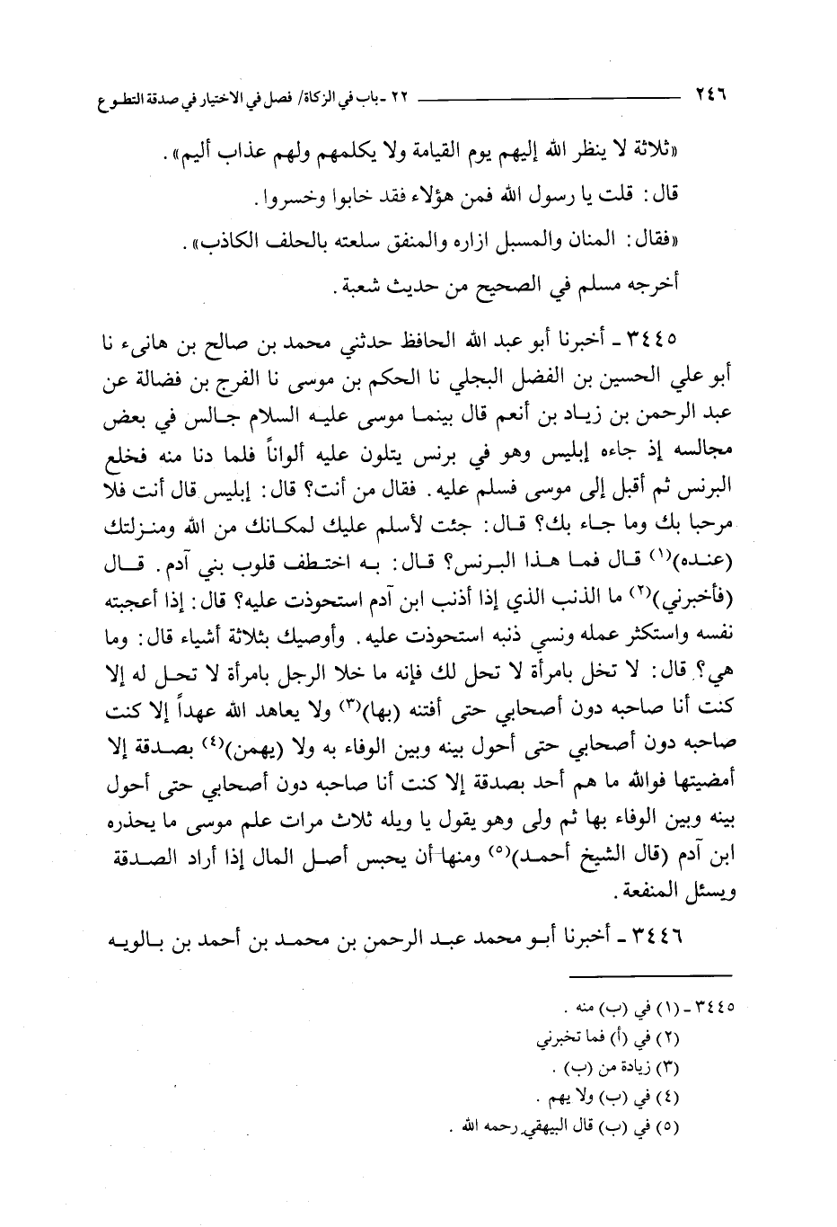 3445 - أخبرنا أبو عبد الله الحافظ حدثني محمد بن صالح بن هانىء نا أبو علي الحسين بن الفضل البجلي نا الحكم بن موسى نا الفرج بن فضالة عن عبد الرحمن بن زياد بن أنعم قال : بينما موسى عليه السلام جالس في بعض مجالسه إذ جاءه إبليس و هو في برنس يتلون عليه ألوانا فلما دنا منه فخلع البرنس ثم أقبل إلى موسى فسلم عليه فقال من أنت ؟ قال : إبليس قال أنت فلا مرحبا بك و ما جاء بك ؟ قال : جئت لأسلم عليك لمكانك من الله و منزلتك عنده قال فما هذا البرنس ؟ قال : به اختطف قلوب بني آدم قال فأخبرني ما الذنب الذي إذا أذنب ابن آدم استحوذت عليه ؟ قال : إذا أعجبته نفسه و استكثر عمله و نسي ذنبه استحوذت عليه و أوصيك بثلاثة أشياء قال : و ما هي ؟ قال : لا تخل بامرأة لا تحل لك فإنه ما خلا الرجل بامرأة لا تحل له إلا كنت أنا صاحبه دون أصحابي حتى أفتنه بها و لا يعاهد الله عهدا إلا كنت صاحبه دون أصحابي حتى أحول بينه و بين الوفاء به و لا يهمن بصدقة إلا أمضيتها فو الله ما هم أحد بصدقة إلا كنت أنا صاحبه دون أصحابي حتى أحول بينه و بين الوفاء بها ثم ولى و هو يقول يا ويله ثلاث مرات علم موسى ما يحذره ابن آدم قال الشيخ أحمد و منها أن يحبس أصل المال إذا أراد الصدقة و يسئل المنفعة