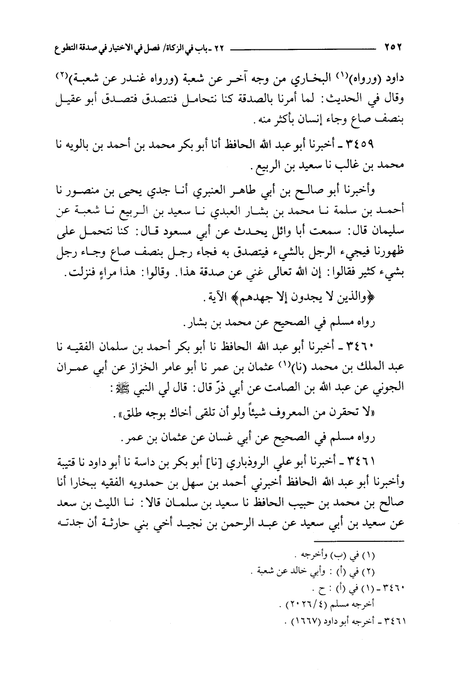 و أخبرنا أبو صالح بن أبي طاهر العنبري أنا جدي يحيى بن منصور نا أحمد بن سلمة نا محمد بن بشار العبدي نا سعيد بن الربيع نا شعبة عن سليمان قال : سمعت أبا وائل يحدث عن أبي مسعود قال : كنا نتحمل على ظهورنا فيجيء الرجل بالشيء فيتصدق به فجاء رجل بنصف صاع و جاء رجل بشيء كثير فقالوا : إن الله تعالى غني عن صدقة هذا و قالوا : هذا مراء فنزلت