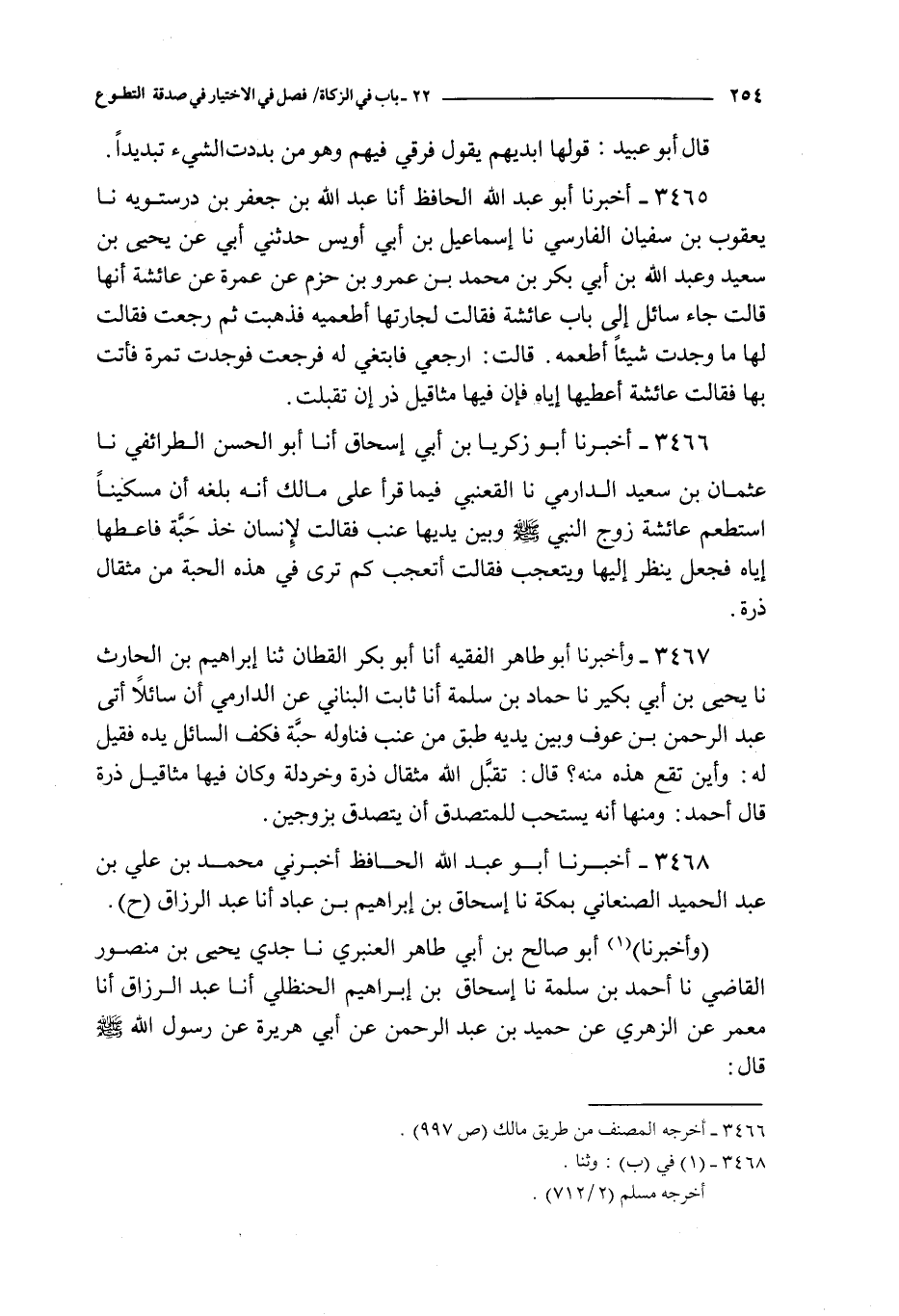 3467 - و أخبرنا أبو طاهر الفقيه أنا أبو بكر القطان ثنا إبراهيم بن الحارث نا يحيى بن أبي بكير نا حماد بن سلمة أنا ثابت البناني عن الدارمي : أن سائلا أتى عبد الرحمن بن عوف و بين يديه طبق من عنب فناوله حبة فكف السائل يده فقيل له : و أين تقع هذه منه ؟ قال : تقبل الله مثقال ذرة و خردلة و كان فيها مثاقيل ذرة قال أحمد : و منها أنه يستحب للمتصدق أن يتصدق بزوجين