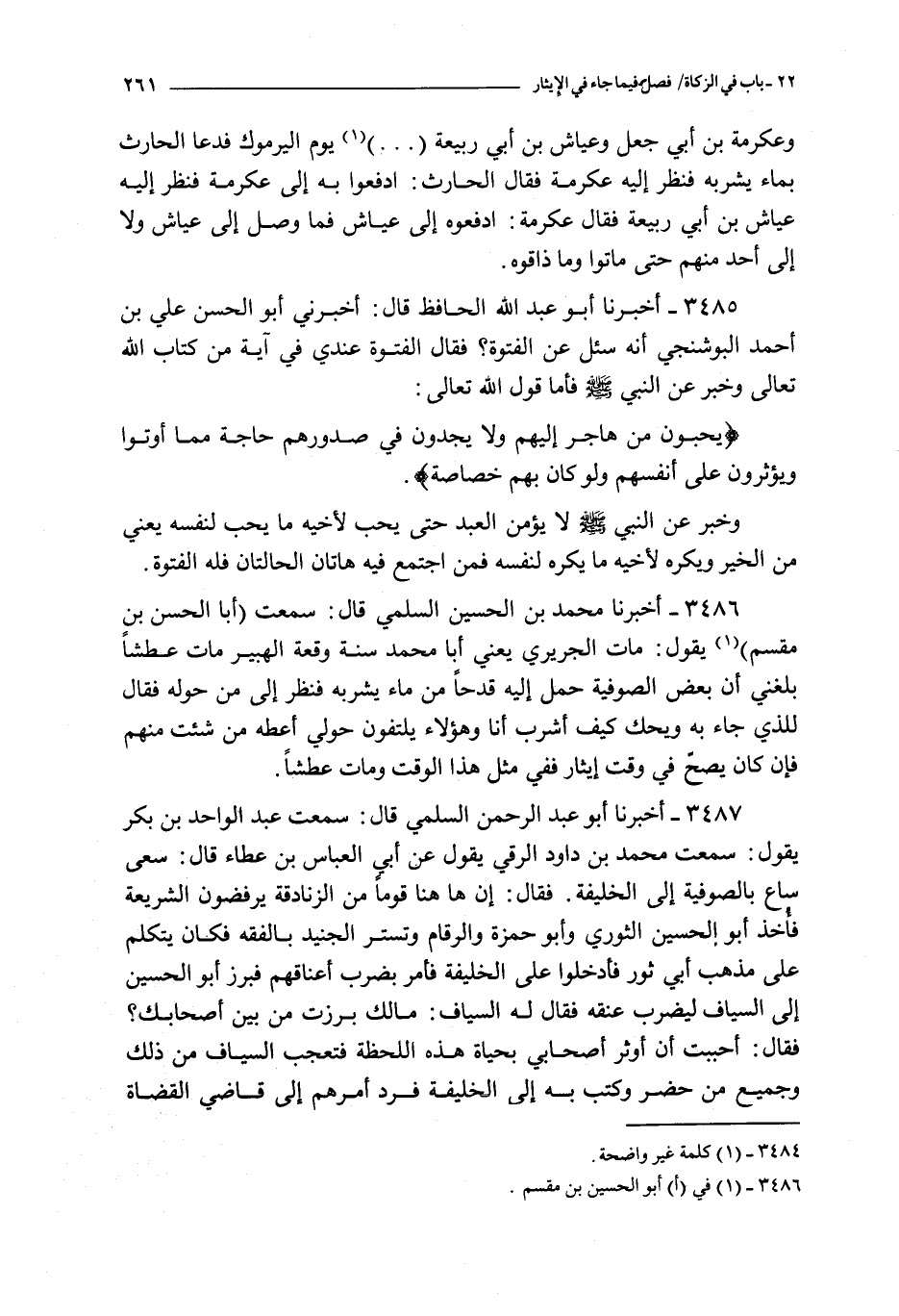 3487 - أخبرنا أبو عبد الرحمن السلمي قال : سمعت عبد الواحد بن بكر يقول : سمعت محمد بن داود الرقي يقول عن أبي العباس بن عطاء قال : سعى بالصوفية إلى الخليفة فقال : إن ها هنا قوما من الزنادقة يرفضون الشريعة فأخذ أبو الحسين الثوري و أبو حمزة و الرقام و تستر الجنيد بالفقه فكان يتكلم على مذهب أبي ثور فادخلوا على الخليفة فأمر بضرب أعناقهم فبرز أبو الحسين إلى السياف ليضرب عنقه فقال له السياف : مالك برزت من بين أصحابك ؟ فقال : أحببت أن أوثر أصحابي بحياة هذه اللحظة فتعجب السياف من ذلك و جميع من حضر و كتب به إلى الخليفة فرد أمرهم إلى قاضي القضاة إسماعيل بن إسحاق فقام إليه الثوري فسأله عن أصول الفرائض في الطهارة و الصلاة فأجابه ثم قال : و بعد هذا فإن لله عبادا يأكلون بالله و يلبسون بالله و يسمعون بالله و يصدرون بالله و يردون بالله فلما سمع القاضي كلامه بكى بكاء شديدا ثم دخل على الخليفة و قال : إن كان هؤلاء القوم الزنادقة فما على وجه الأرض موحد