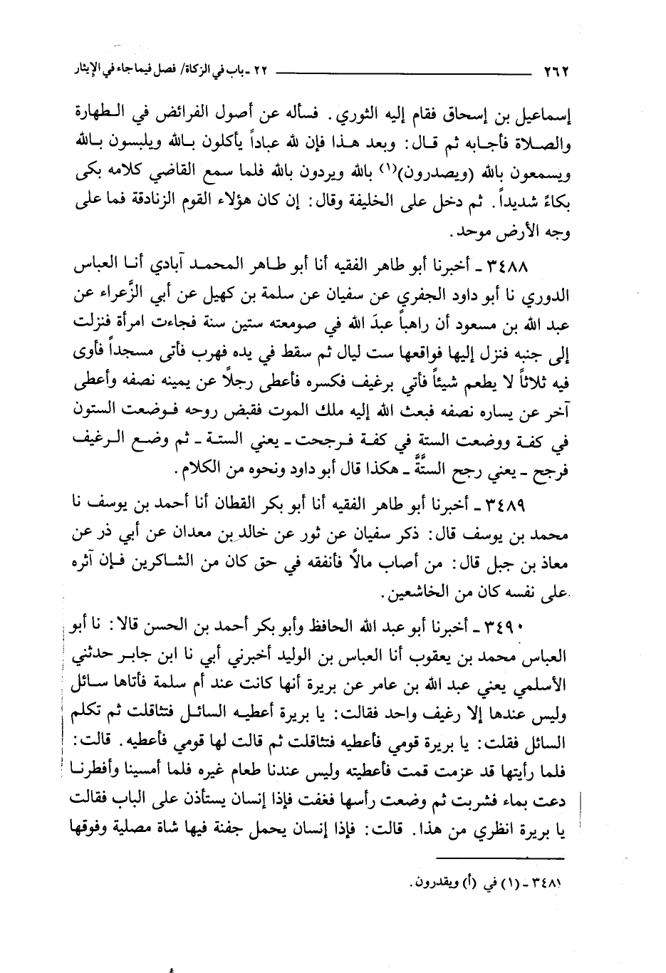 3489 - أخبرنا أبو طاهر الفقيه أنا أبو بكر القطان أنا أحمد بن يوسف نا محمد بن يوسف قال : ذكر سفيان عن ثور عن خالد بن معدان عن أبي ذر عن معاذ بن جبل قال : من أصاب مالا فأنفقه في حق كان من الشاكرين فإن آثره على نفسه كان من الخاشعين