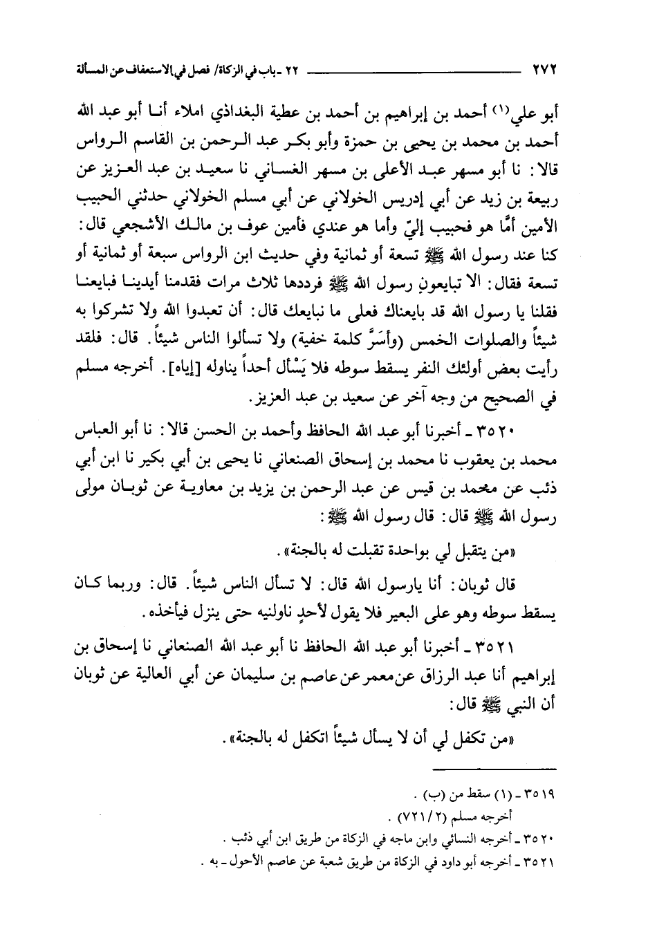 قال ثوبان : أنا يا رسول الله قال : لا تسأل الناس شيئا قال : و ربما كان يسقط سوطه و هو على البعير فلا يقول لأحد ناولنيه حتى ينزل فيأخذه