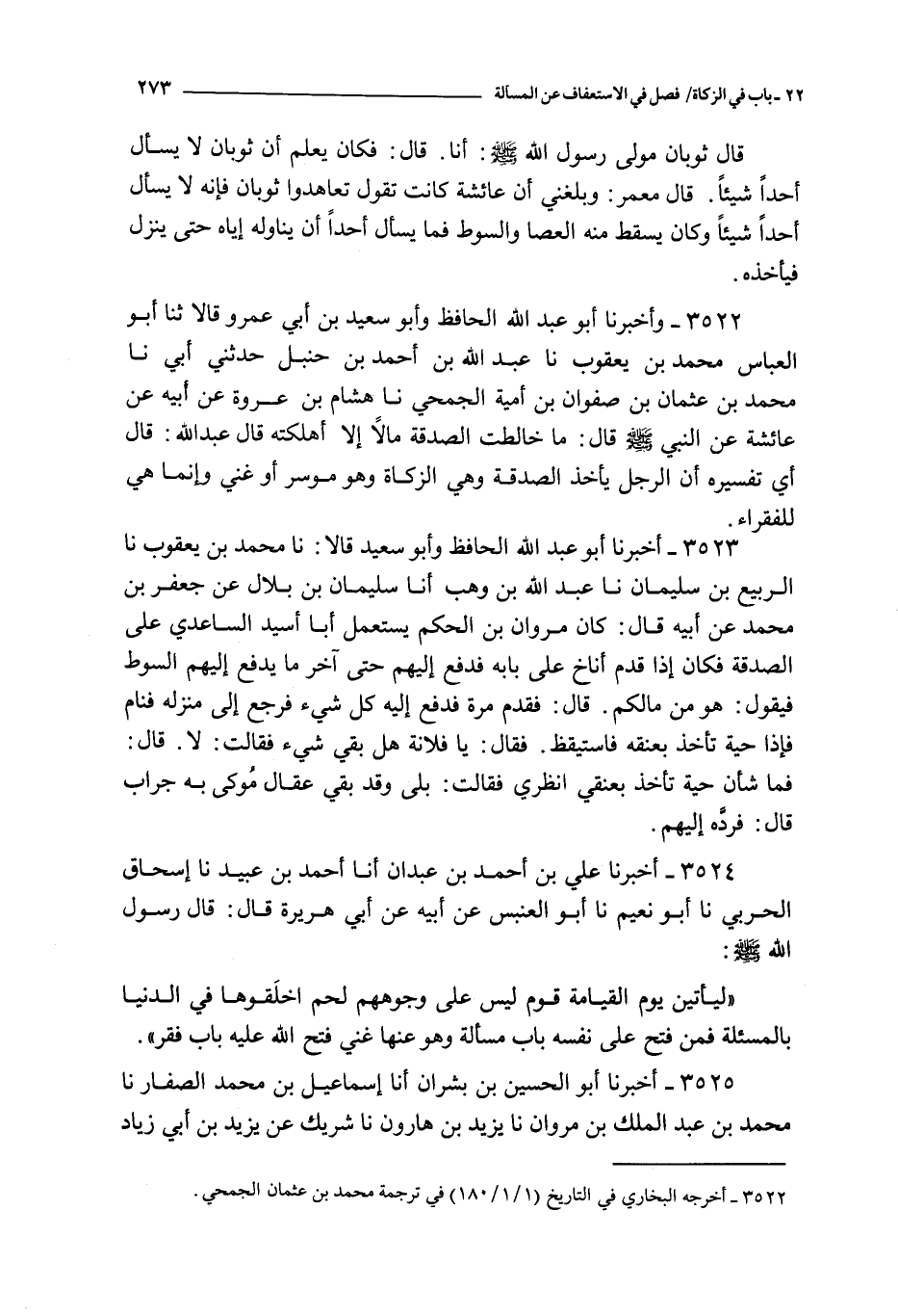 3522 - و أخبرنا أبو عبد الله الحافظ و أبو سعيد بن أبي عمرو قالا ثنا أبو العباس محمد بن يعقوب نا عبد الله بن أحمد بن حنبل حدثني أبي نا محمد بن عثمان بن صفوان بن أمية الجمحي نا هشام بن عروة عن أبيه عن عائشة : عن النبي صلى الله عليه و سلم قال : ما خالطت الصدقة مالا إلا أهلكته قال عبد الله : قال أي تفسيره أن الرجل يأخذ الصدقة و هي الزكاة و هو موسر أو غني و إنما هي للفقراء