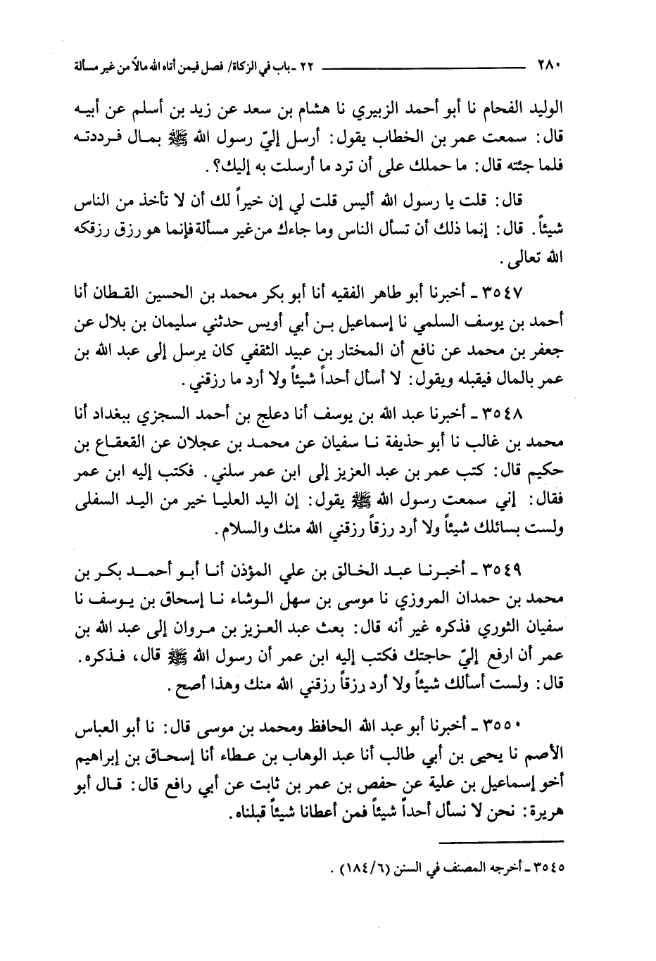 3549 - أخبرنا عبد الخالق بن علي المؤذن أنا أبو أحمد بكر بن محمد بن حمدان المروزي نا موسى بن سهل الوشاء نا إسحاق بن يوسف نا سفيان الثوري : فذكره غير أنه قال : بعث عبد العزيز بن مروان إلى عبد الله بن عمر أن أرفع إلي حاجتك فكتب إليه ابن عمر أن رسول الله صلى الله عليه و سلم قال فذكره