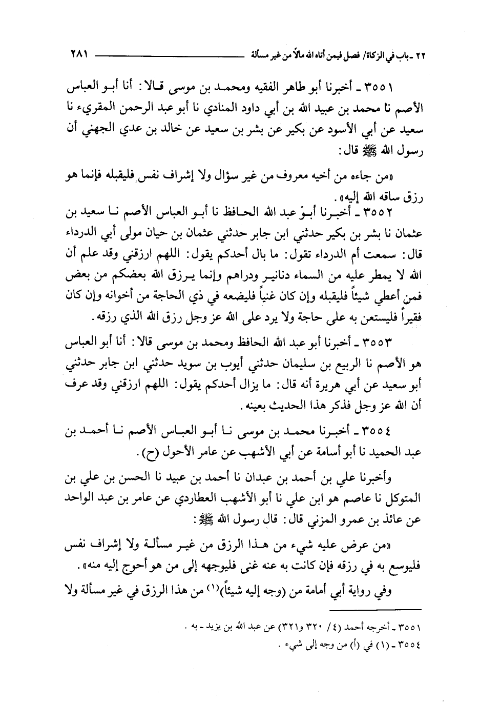 3553 - أخبرنا أبو عبد الله الحافظ و محمد بن موسى قالا : أنا أبو العباس هو الأصم نا الربيع بن سليمان حدثني أيوب بن سويد حدثني ابن جابر حدثني أبو سعيد عن أبي هريرة أنه قال : ما يزال أحدكم يقول : اللهم ارزقني و قد عرف أن الله عز و جل فذكر هذا الحديث بعينه
