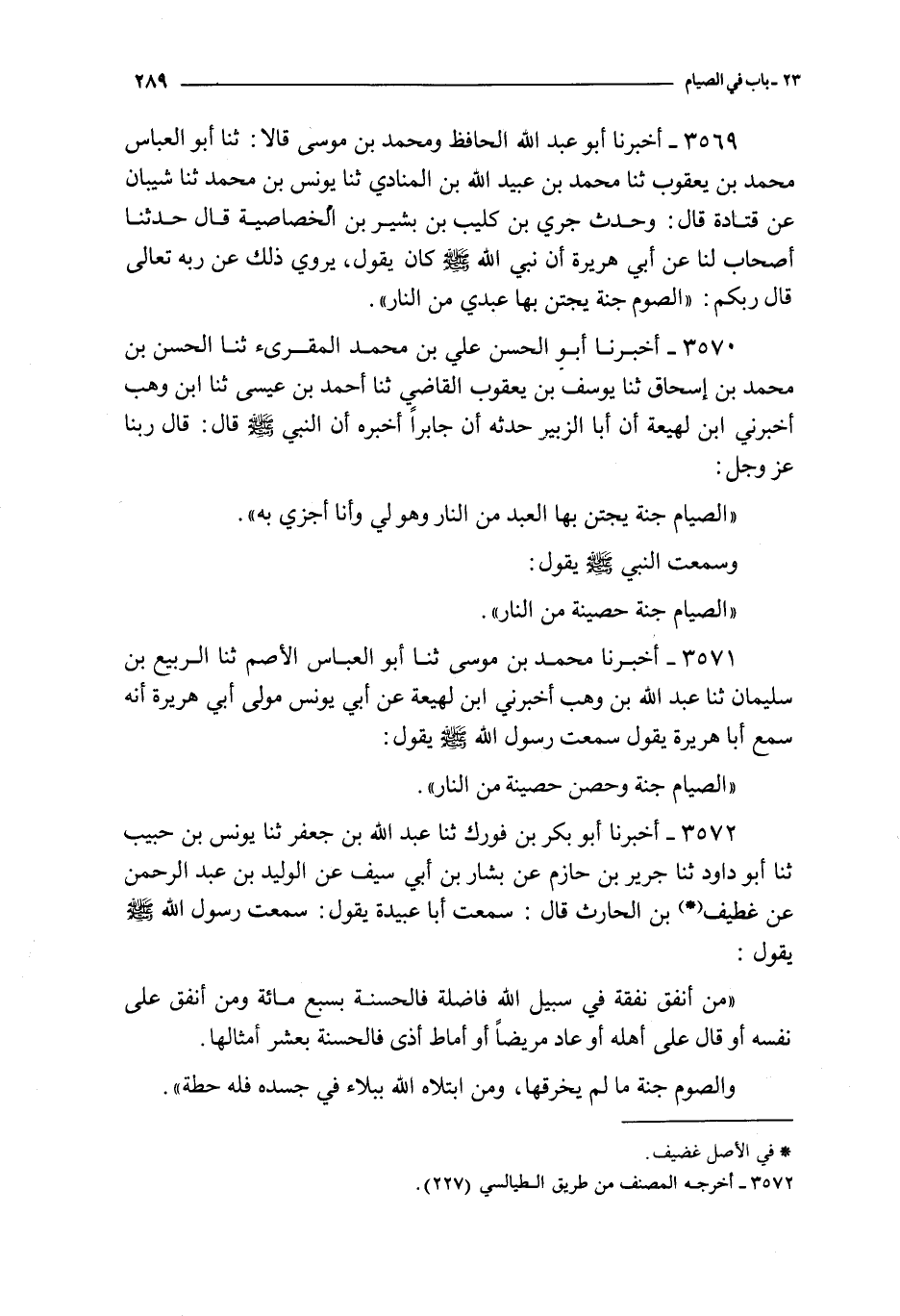 3569 - أخبرنا أبو عبد الله الحافظ و محمد بن موسى : ثنا أبو العباس محمد بن يعقوب ثنا محمد بن عبيد الله بن المنادي ثنا يونس بن محمد ثنا شيبان عن قتادة قال : و حدث جري بن كليب بن بشير بن الخصاصية قال حدثنا أصحاب لنا عن أبي هريرة : أن نبي الله صلى الله عليه و سلم كان يقول يروي ذلك عن ربه تعالى قال ربكم : ( الصوم جنة يجتن بها عبدي من النار )