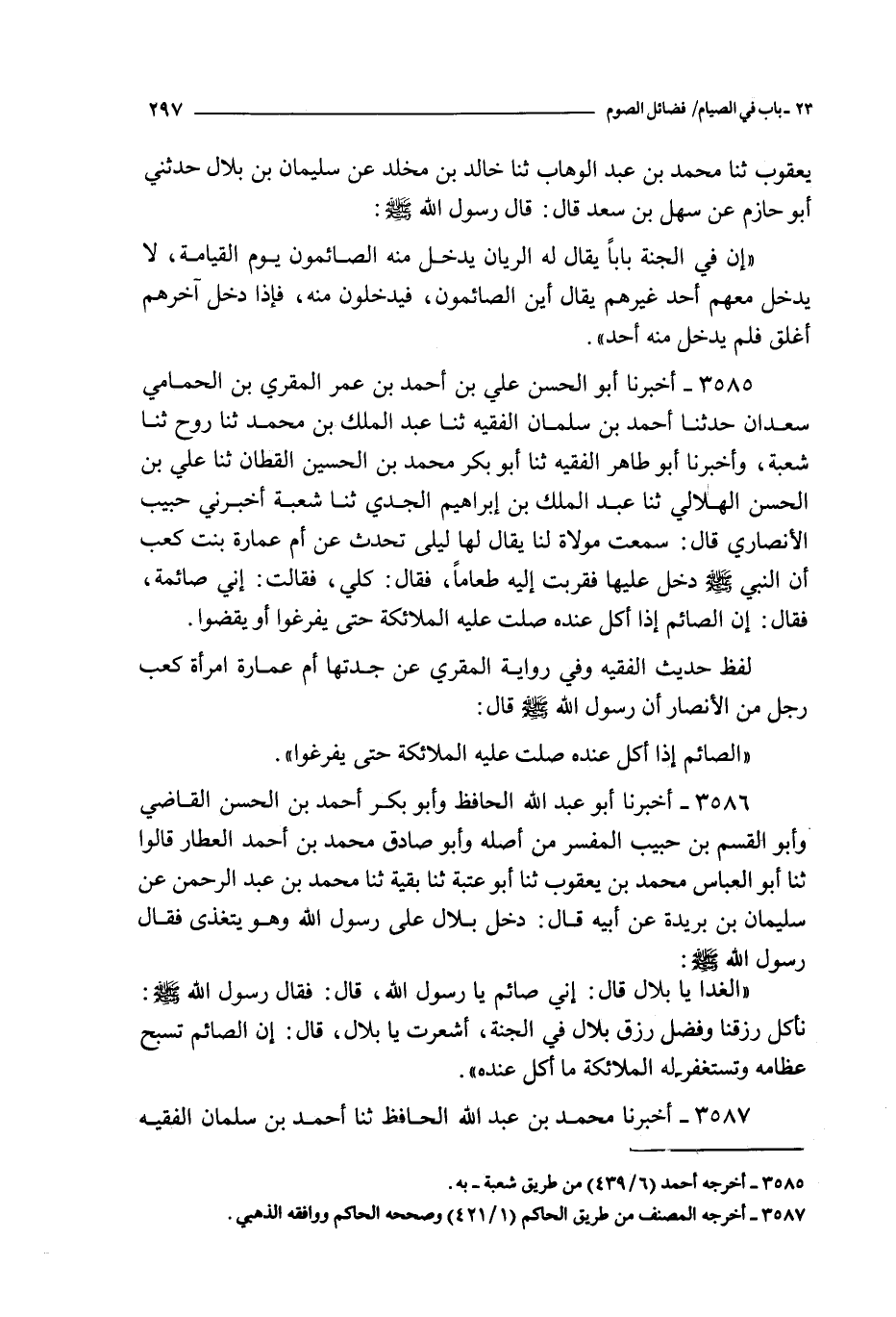 3585 - أخبرنا أبو الحسن علي بن أحمد بن عمر المقري بن الحمامي سعدان حدثنا أحمد بن سلمان الفقيه ثنا عبد الملك بن محمد ثنا روح ثنا شعبة و أخبرنا أبو طاهر الفقيه ثنا أبو بكر محمد بن الحسين القطان ثنا علي بن الحسن الهلالي ثنا عبد الملك بن إبراهيم الجدي ثنا شعبة أخبرني حبيب الأنصاري قال : سمعت مولاة لنا يقال لها ليلى تحدث عن أم عمارة بنت كعب : أن النبي صلى الله عليه و سلم دخل عليها فقربت إليه طعاما فقال : كلي فقالت : إني صائمة فقال : إن الصائم إذا أكل عنده صلت عليه الملائكة حتى يفرغوا أو يقضوا