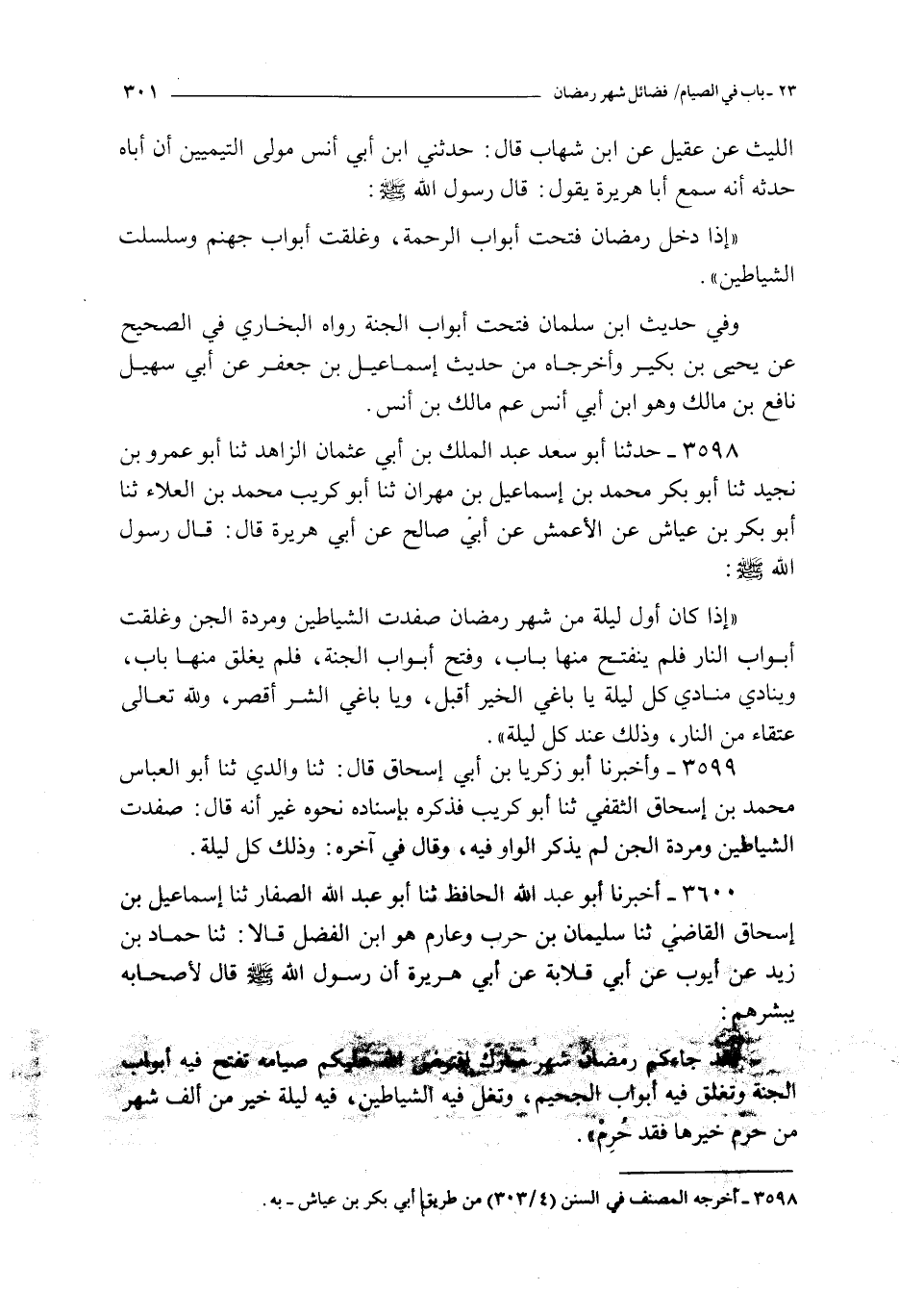 3599 - و أخبرنا أبو زكريا بن أبي إسحاق قال : ثنا والدي ثنا أبو العباس محمد بن إسحاق الثقفي ثنا أبو كريب : فذكره بإسناده نحوه غير أنه قال : صفدت الشياطين و مردة الجن لم يذكر الواو فيه و قال في آخره : و ذلك كل ليلة