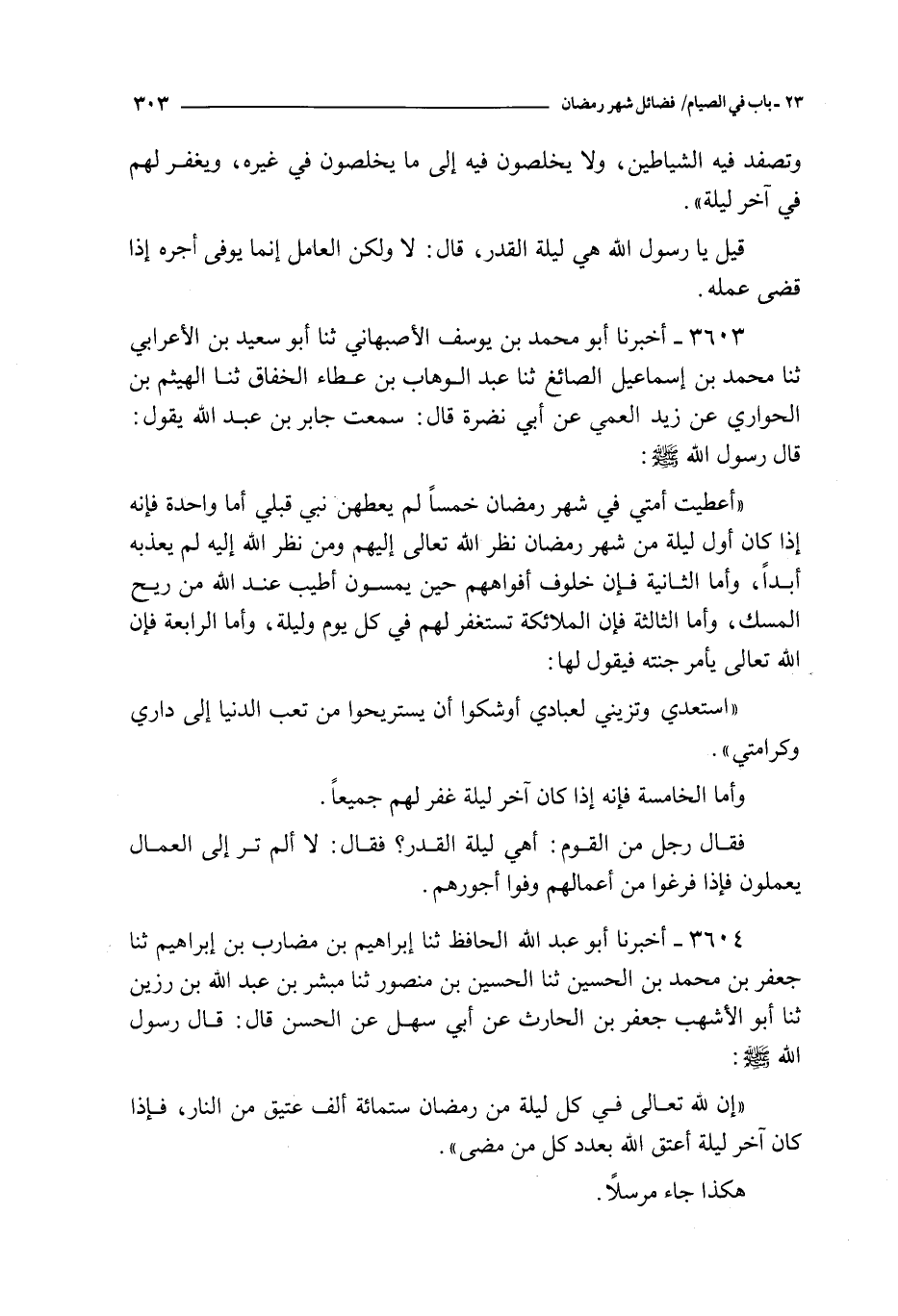 3603 - أخبرنا أبو محمد بن يوسف الأصبهاني ثنا أبو سعيد بن الأعرابي ثنا محمد بن إسماعيل الصائغ ثنا عبد الوهاب بن عطاء الخفاق ثنا الهيثم بن الحواري عن زيد العمي عن أبي نضرة قال : سمعت جابر بن عبد الله يقول : قال رسول الله صلى الله عليه و سلم :