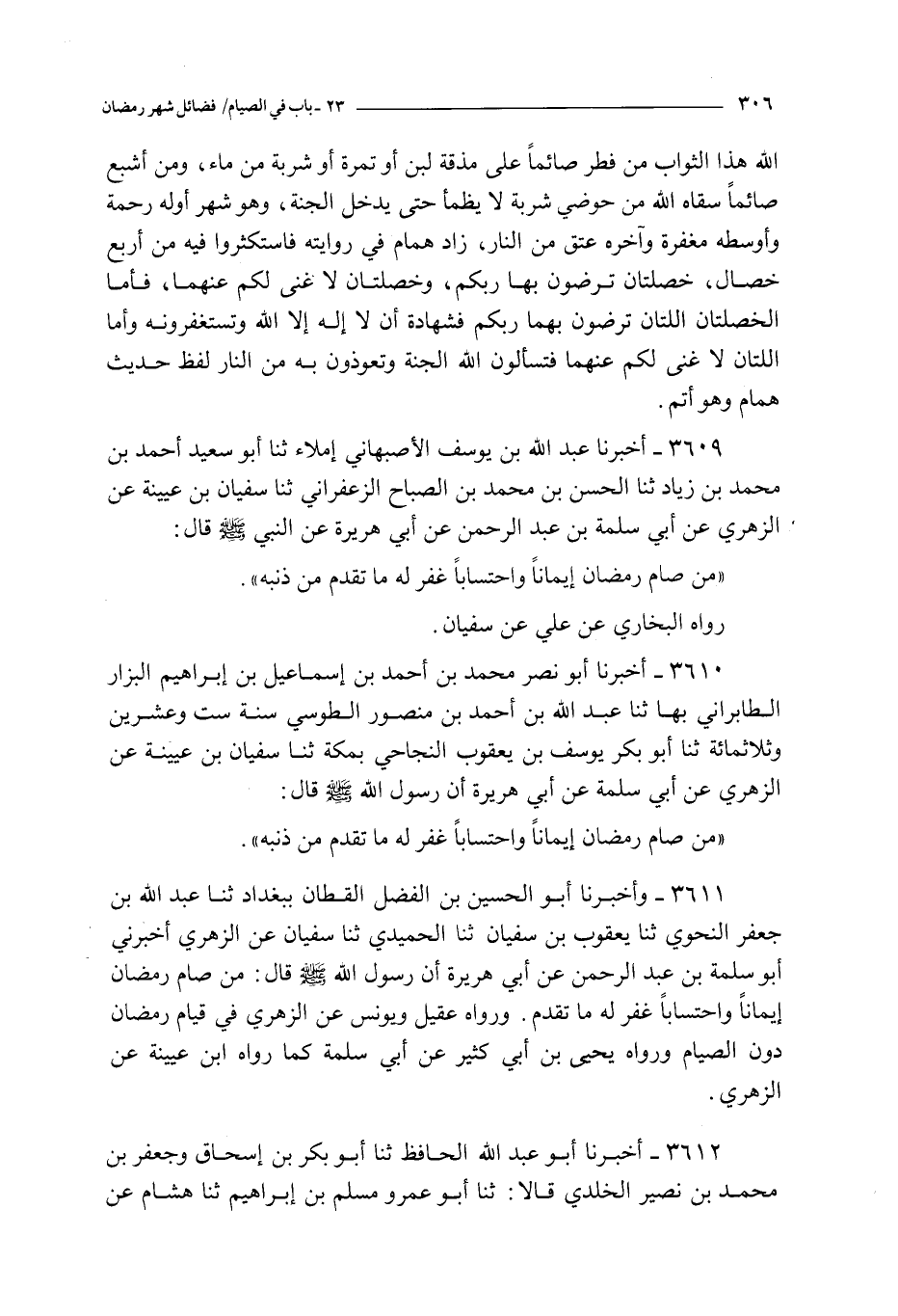 3609 - أخبرنا عبد الله بن يوسف الأصبهاني إملاء ثنا أبو سعيد أحمد بن محمد بن زياد ثنا الحسن بن محمد بن الصباح الزعفراني ثنا سفيان بن عيينة عن الزهري عن أبي سلمة بن عبد الرحمن عن أبي هريرة : عن النبي صلى الله عليه و سلم قال :