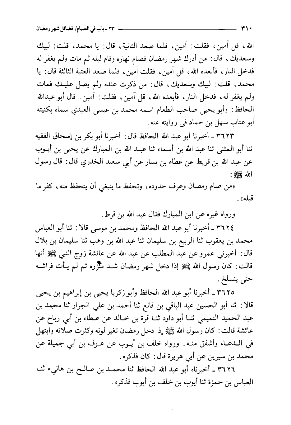 3623 - أخبرنا أبو عبد الله الحافظ قال : أخبرنا أبو بكر بن إسحاق الفقيه ثنا أبو المثنى ثنا عبد الله بن أسماء ثنا عبد الله بن المبارك عن يحيى بن أيوب عن عبد الله بن قريط عن عطاء بن يسار عن أبي سعيد الخدري قال : قال رسول الله صلى الله عليه و سلم :