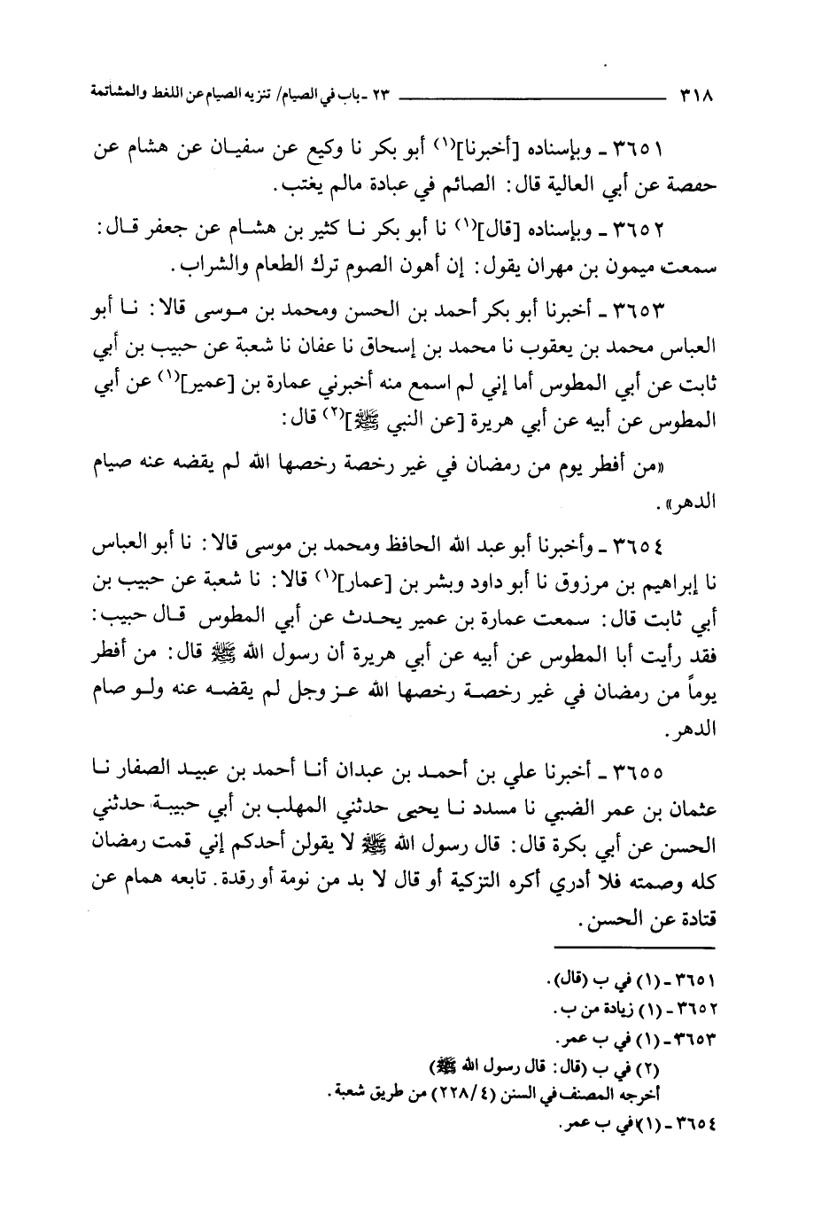 3651 - و بإسناده أخبرنا أبو بكر نا وكيع عن سفيان عن هشام عن حفصة عن أبي العالية قال : الصائم في عبادة ما لم يغتب