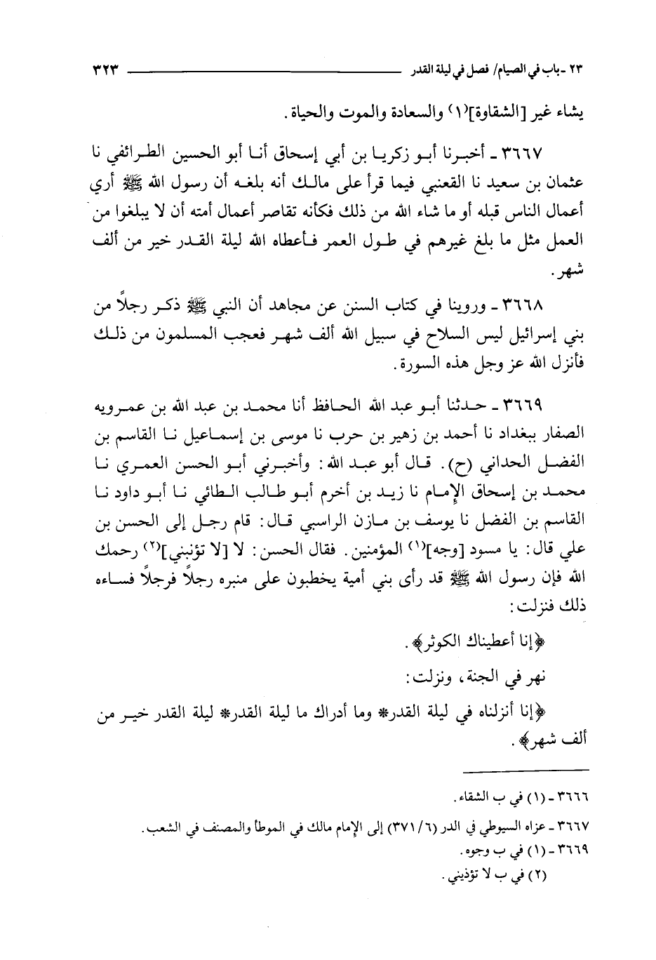 3667 - أخبرنا أبو زكريا بن أبي إسحاق أنا أبو الحسين الطرائفي نا عثمان بن سعيد نا القعنبي فيما قرأ على مالك أنه بلغه : أن رسول الله صلى الله عليه و سلم أري أعمال الناس قبله أو ما شاء الله من ذلك فكأنه تقاصر أعمال أمته أن لا يبلغوا من العمل مثل ما بلغ غيرهم في طول العمر فأعطاه الله ليلة القدر خير من ألف شهر