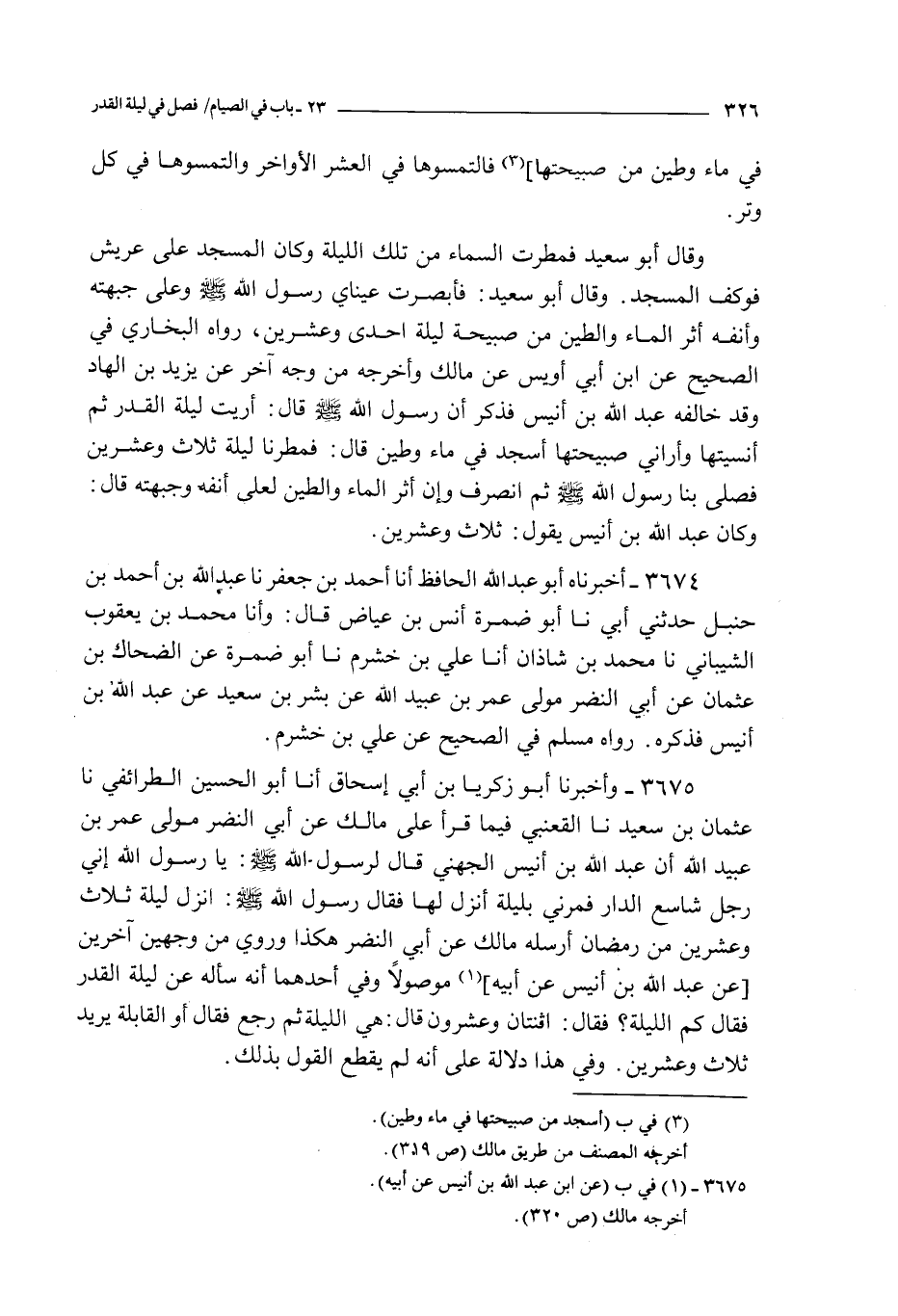 3675 - و أخبرنا أبو زكريا بن أبي إسحاق أنا أبو الحسين الطرائفي نا عثمان بن سعيد نا القعنبي فيما قرأ على مالك عن أبي النضر مولى عمر بن عبيد الله : أن عبد الله بن أنيس الجهني قال لرسول الله صلى الله عليه و سلم : يا رسول الله إني رجل شاسع الدار فمرني بليلة أنزل لها فقال رسول الله صلى الله عليه و سلم : أنزل ليلة ثلاث و عشرين من رمضان أرسله مالك عن أبي النضر هكذا و روي من وجهين آخرين عن عبد الله بن أنيس عن أبيه موصولا و في أحدهما أنه سأله عن ليلة القدر فقال كم الليلة ؟ فقال : اثنتان و عشرون قال : هي الليلة ثم رجع فقال أو القابلة يريد ثلاث و عشرين و في هذا دلالة على أنه لم يقطع القول بذلك