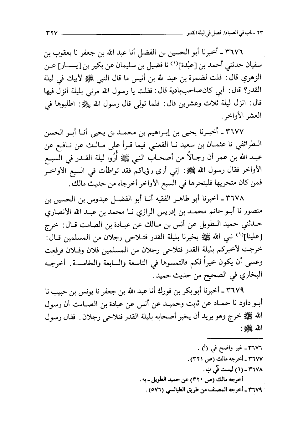 3679 - أخبرنا أبو بكر بن فورك أنا عبد الله بن جعفر نا يونس بن حبيب نا أبو داود نا حماد عن ثابت و حميد عن أنس عن عبادة بن الصامت : أن رسول الله صلى الله عليه و سلم خرج و هو يريد أن يخبر أصحابه بليلة القدر فتلاحى رجلان فقال رسول الله صلى الله عليه و سلم :