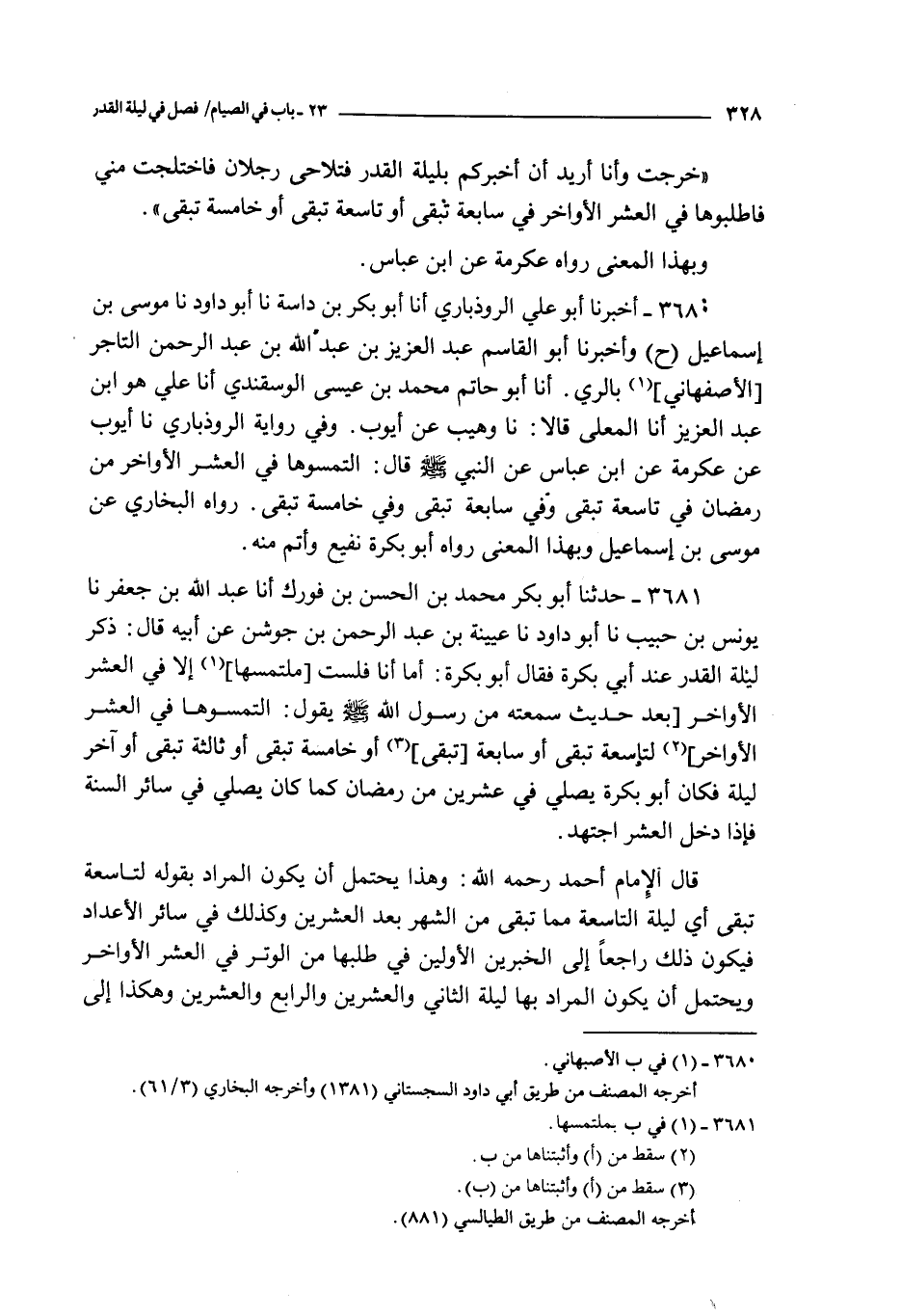 قال الإمام أحمد رحمه الله : و هذا يحتمل أن يكون المراد بقوله لتاسعة تبقى أي ليلة التاسعة مما تبقى من الشهر بعد العشرين و كذلك في سائر الأعداد فيكون ذلك راجعا إلى الخبرين الأولين في طلبها من الوتر في العشر الأواخر و يحتمل أن يكون المراد بها ليلة الثاني و العشرين و الرابع و العشرين و هكذا إلى آخره و هي الليلة التي تبقى بعدها من الشهر العدد المذكور فيه و على هذا يدل ما روى أبو نضرة عن أبي سعيد الخدري فيها