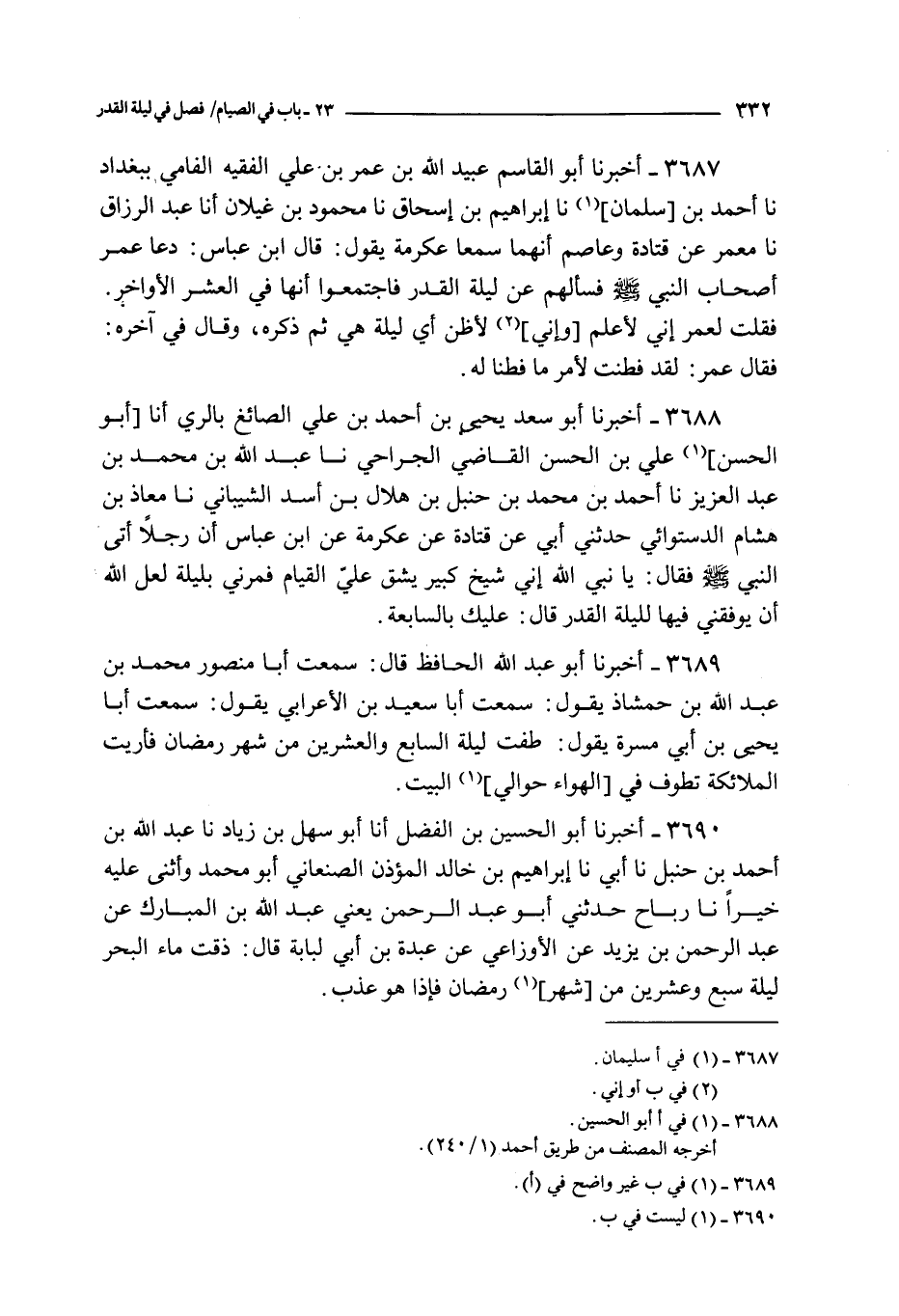 3688 - أخبرنا أبو سعد يحيى بن أحمد بن علي الصائغ بالري أنا أبو الحسن علي بن الحسن القاضي الجراحي نا عبد الله بن محمد بن عبد العزيز نا أحمد بن محمد بن حنبل بن هلال بن أسد الشيباني نا معاذ بن هشام الدستوائي حدثني أبي عن قتادة عن عكرمة عن ابن عباس : أن رجلا أتى النبي صلى الله عليه و سلم فقال : يا نبي الله إني شيخ كبير يشق علي القيام فمرني بليلة لعل الله أن يوفقني فيها لليلة القدر قال : عليك بالسابعة